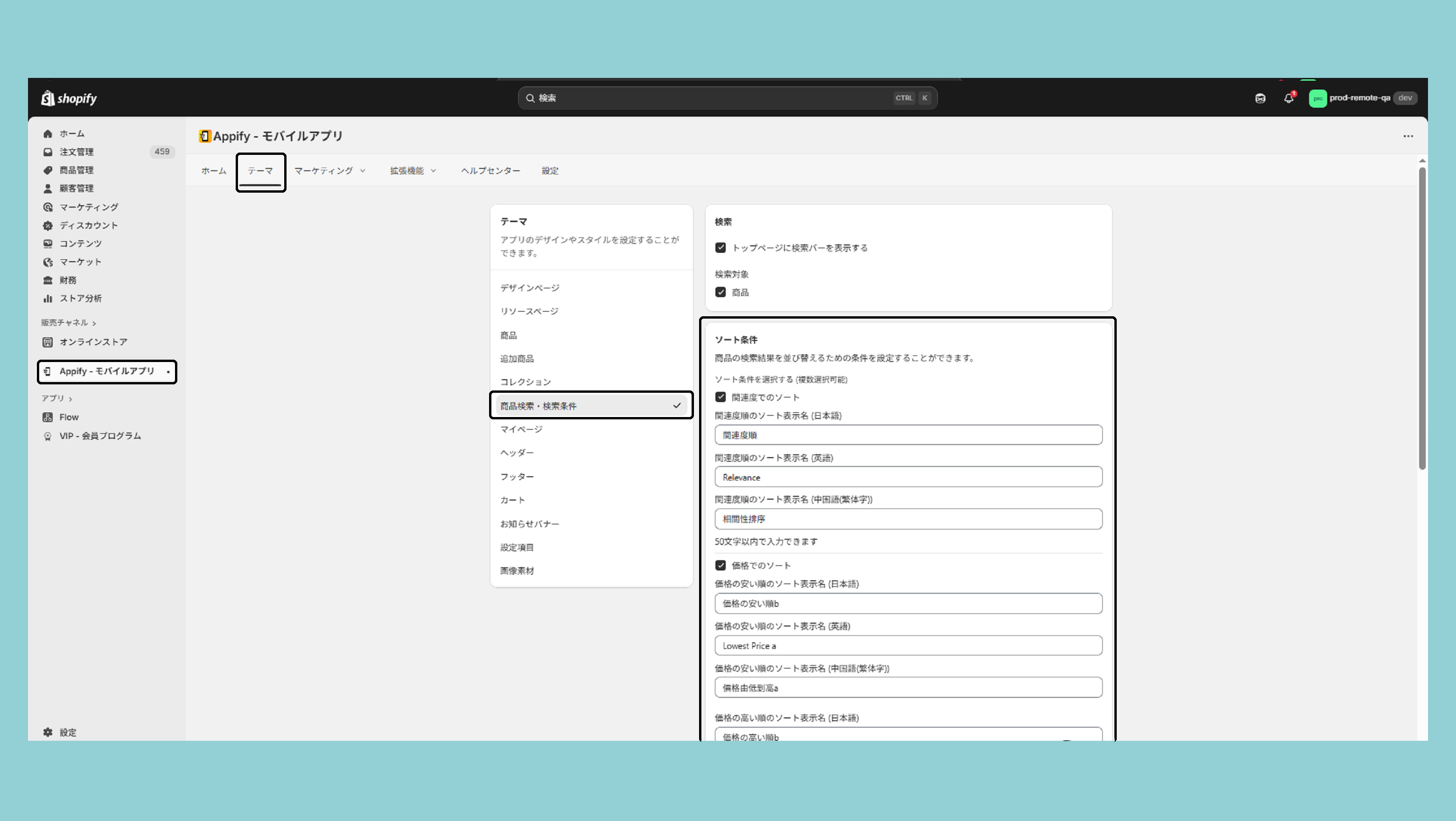 Shopify管理画面>販売チャネル>Appify>テーマ>商品検索・検索条件>ソート条件からソート条件をチェックします。