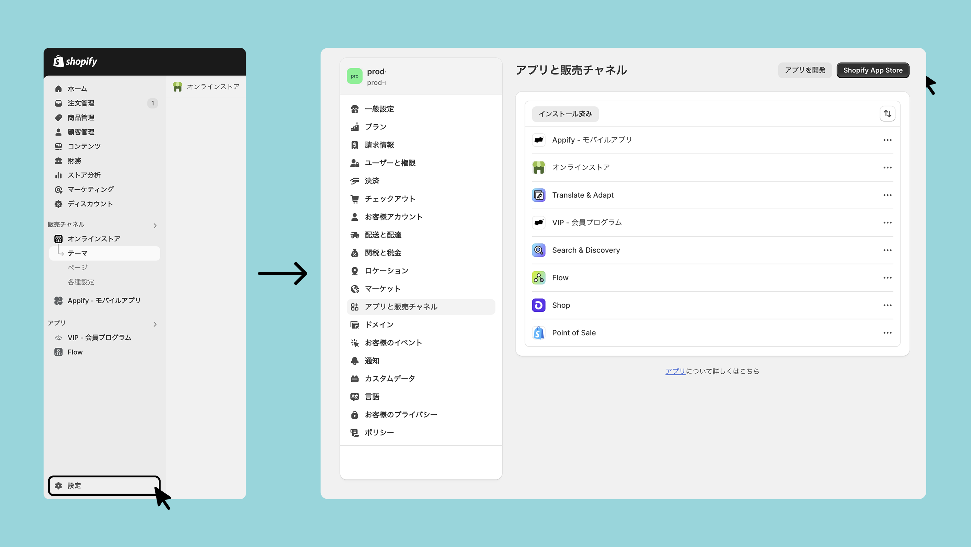 Shopify app storeは、設定>アプリと販売チャネル>Shopify app storeからアクセスできます。