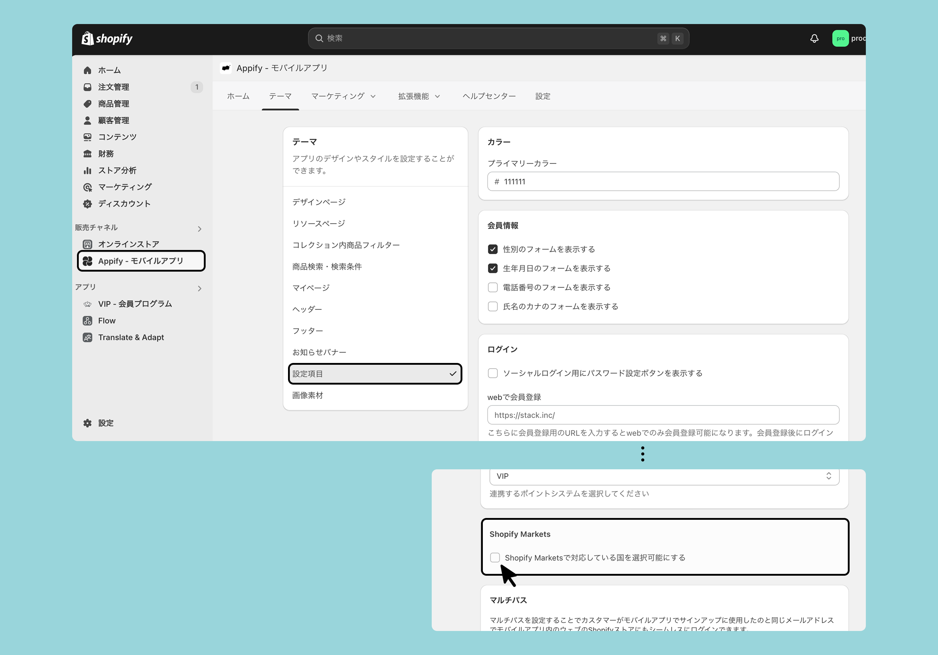 Appifyの設定画面>設定>テーマ>設定項目>Shopify Marketsにチェックしてください。
