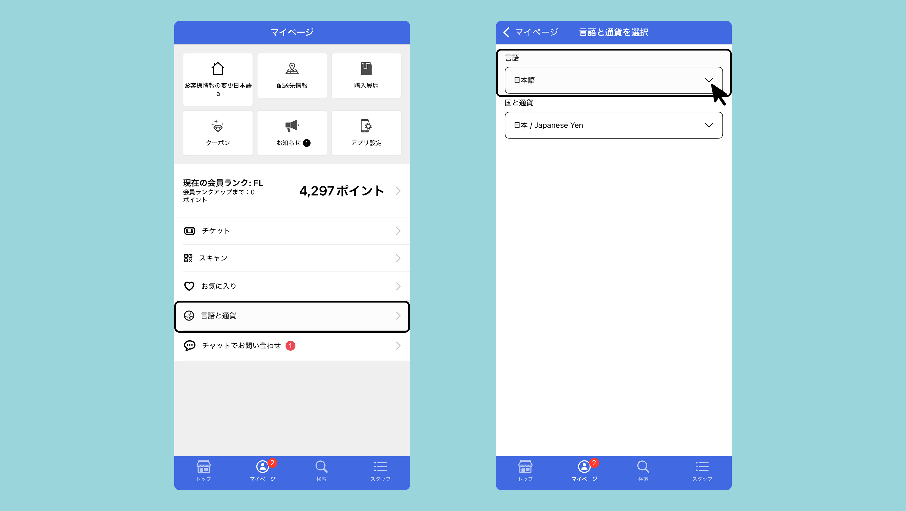言語の切り替えは、モバイルアプリ>マイページ>言語と通貨から変更可能です。
