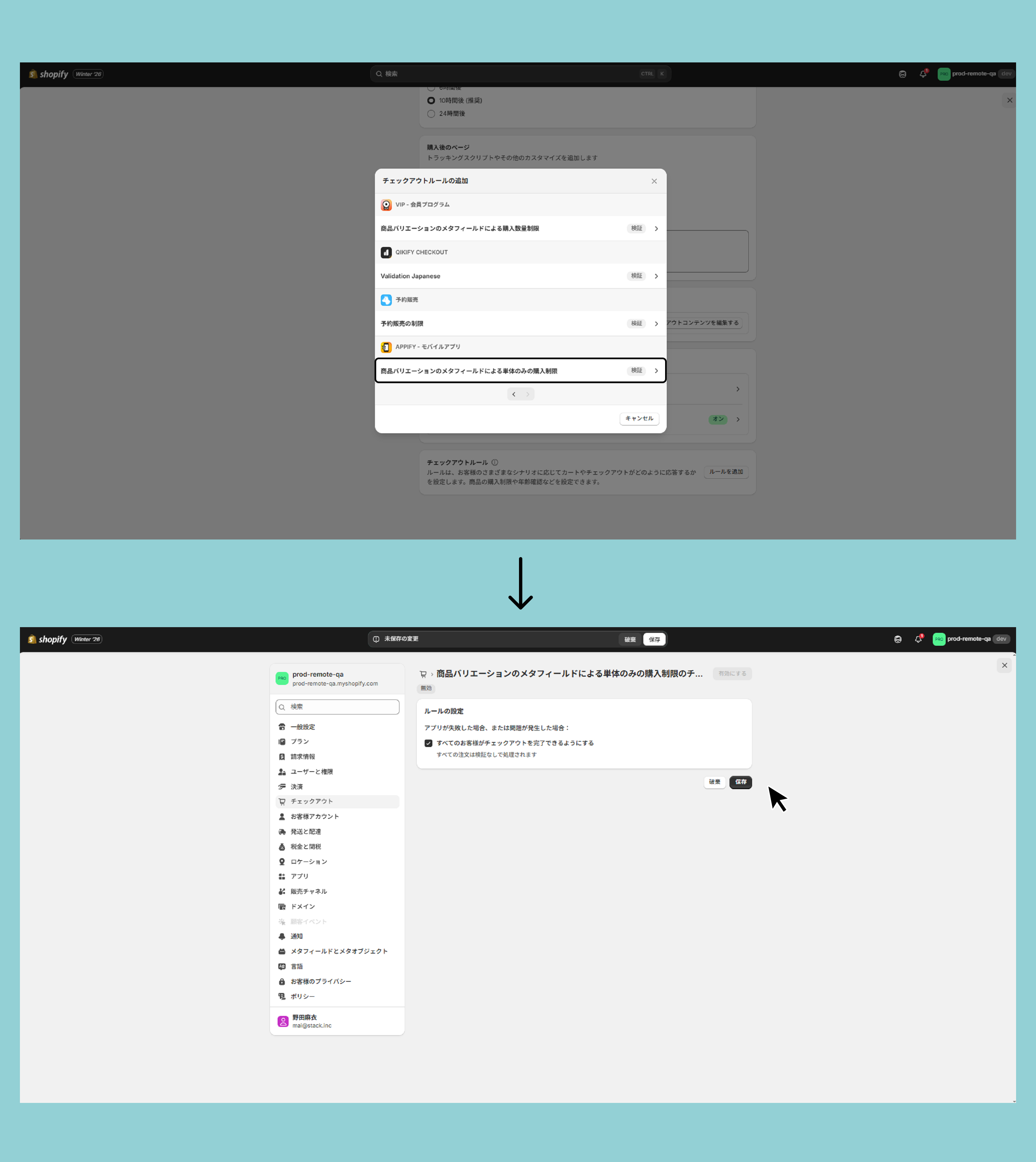 Shopify管理画面>設定>チェックアウトに進み、ページ下部の「チェックアウトルール」から「ルールを追加」をクリックします。「商品バリエーションのメタフィールドによる単体のみの購入制限」を選択し、遷移先で「保存」をクリックします。