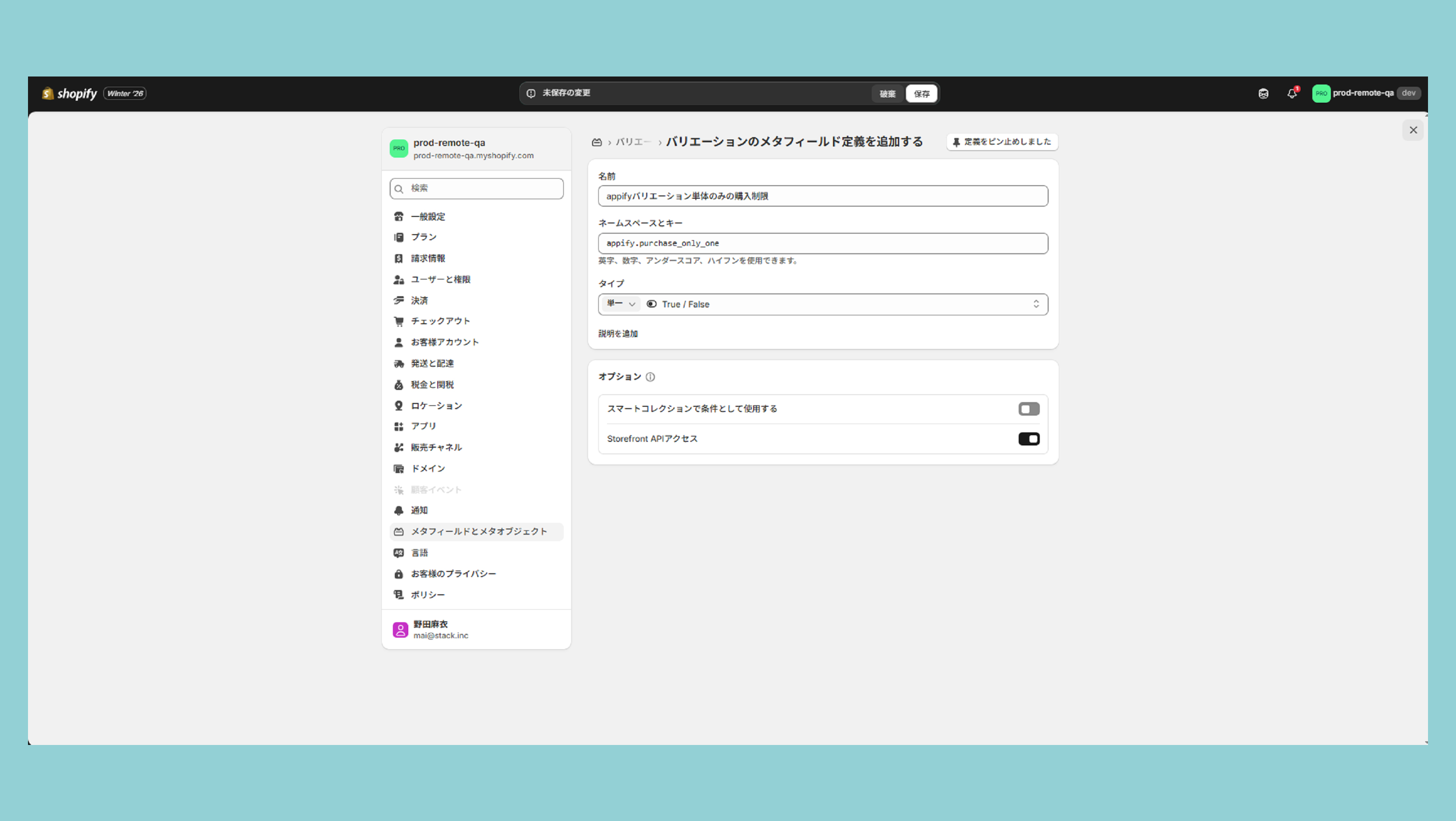 商品バリエーション単体で購入制限を行うには、次に設定をするメタフィールドで対象商品のバリエーションに対してTRUEに設定をします。