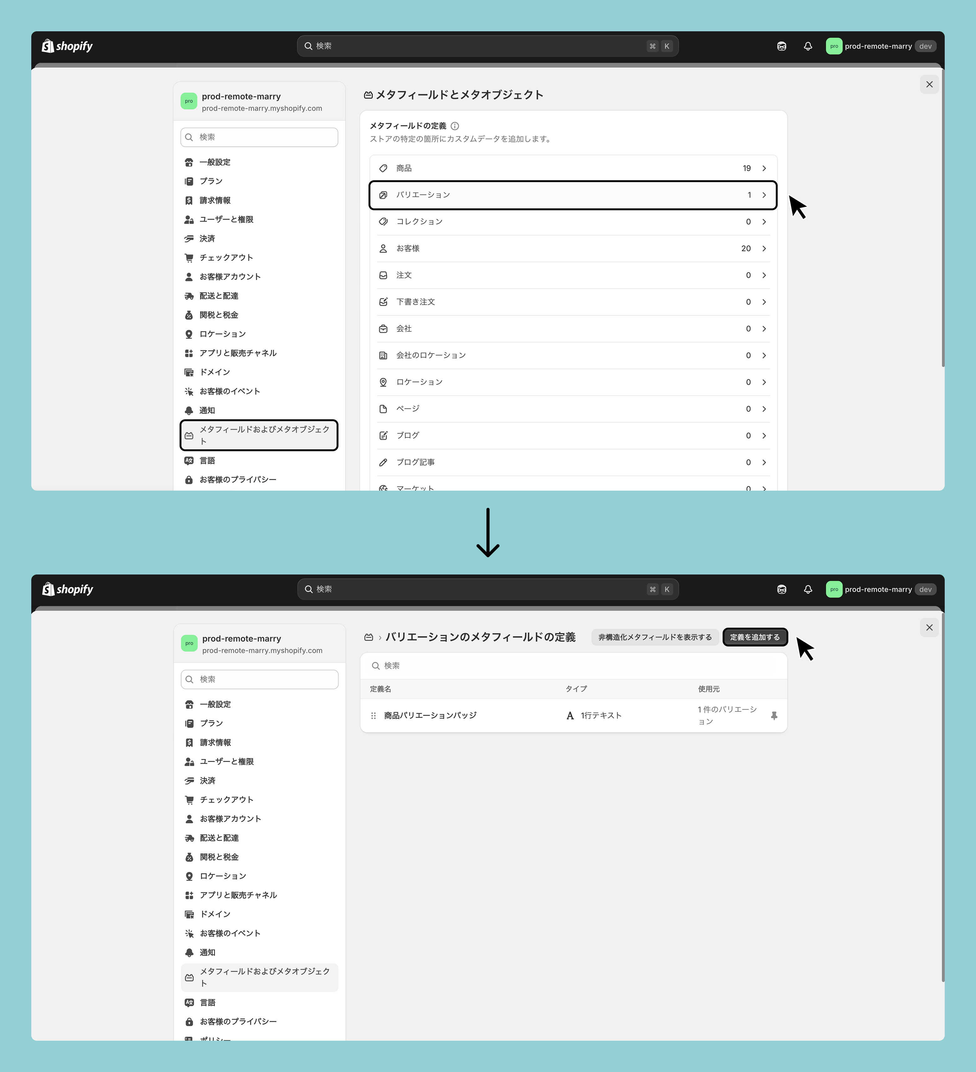 Shopify管理画面>設定>メタフィールドおよびメタオブジェクトに進み、「バリエーション」をクリックします。次に「定義を追加する」ボタンをクリックし、各項目に下記の内容を入力してください。