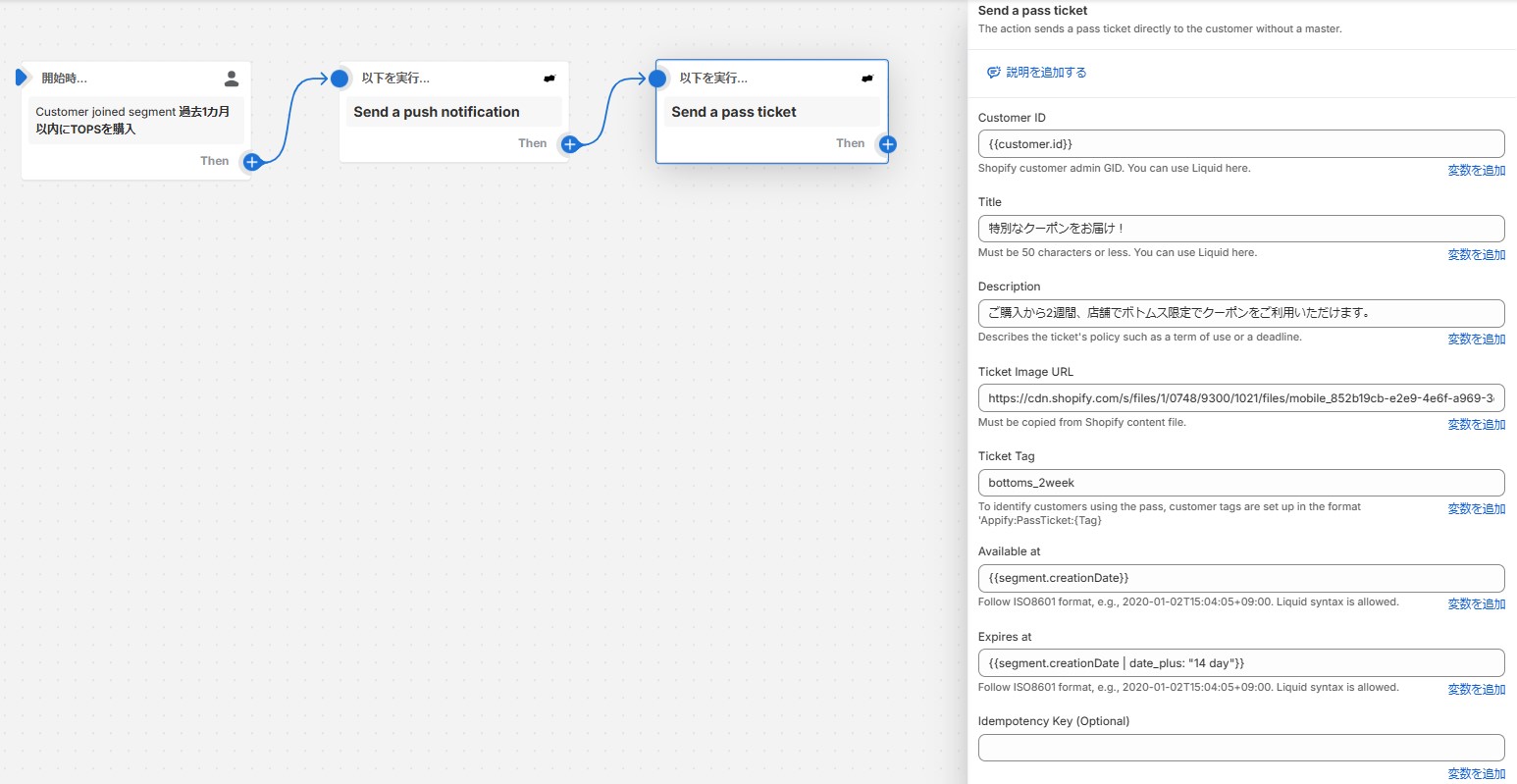 Ticket Tag | パスを利用した顧客を識別できるように「Appify:PassTicket:{Tag}」というフォーマットでタグを設置します。 |