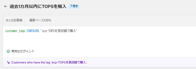 EC powerで商品タイプ[TOPS]、販売チャネル[POS]、購入期間を絞ってセグメント作成してください。セグメント作成後、Shopifyに顧客タグの自動同期を行ってください。 ※この際、顧客セグメントに追加してください。