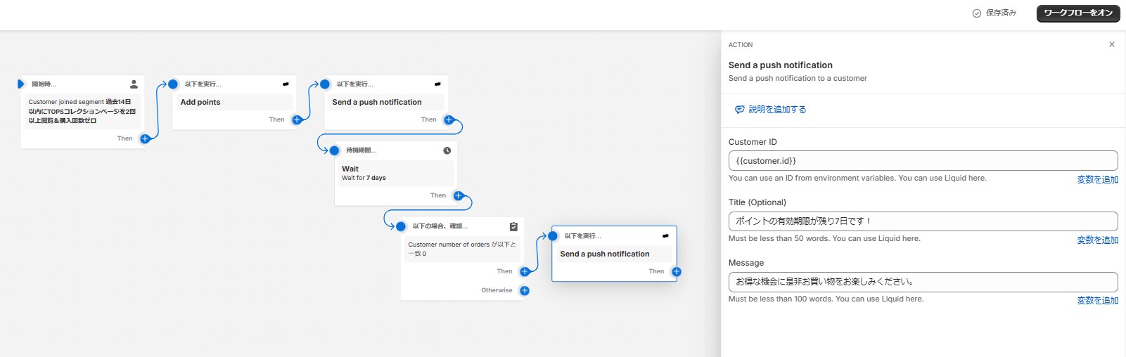 storefront.collection_viewed(since: -14d, count_at_least: 2, id: {コレクションページID}) = true AND number_of_orders = 0※この場合は過去14日以内に同じコレクションページを2回以上閲覧しているかつ購入回数が0のユーザーです。ワークフローを作成、トリガーに