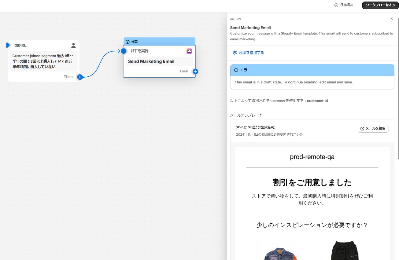 orders_placed(since: -180d) = false AND orders_placed(count_at_least: 3, since: -12m, until: -180d) = true※期間はっ必要に応じて設定変更してください。 ※この場合は、"過去1年~半年の間で3回以上購入していて直近半年以内に購入していない"ユーザーになります。ワークフローを作成、トリガーに