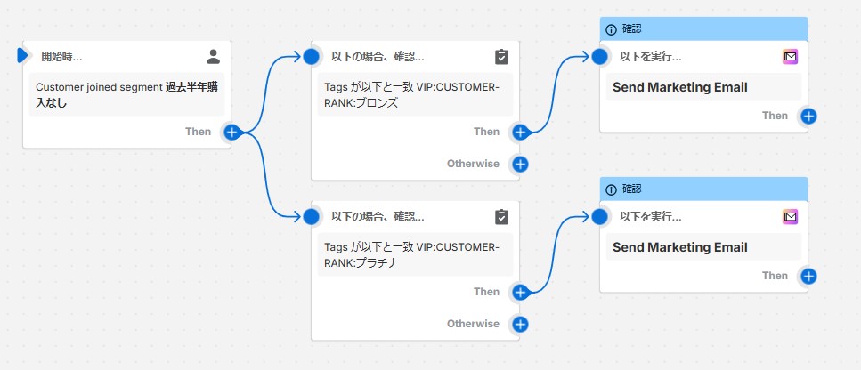 customer / tagsを選択し、VIP:CUSTOMER-RANK:{ランク名}形式でTagsをランク毎に分岐設定してください。※ランク別に通知を送りたい場合に有効です。