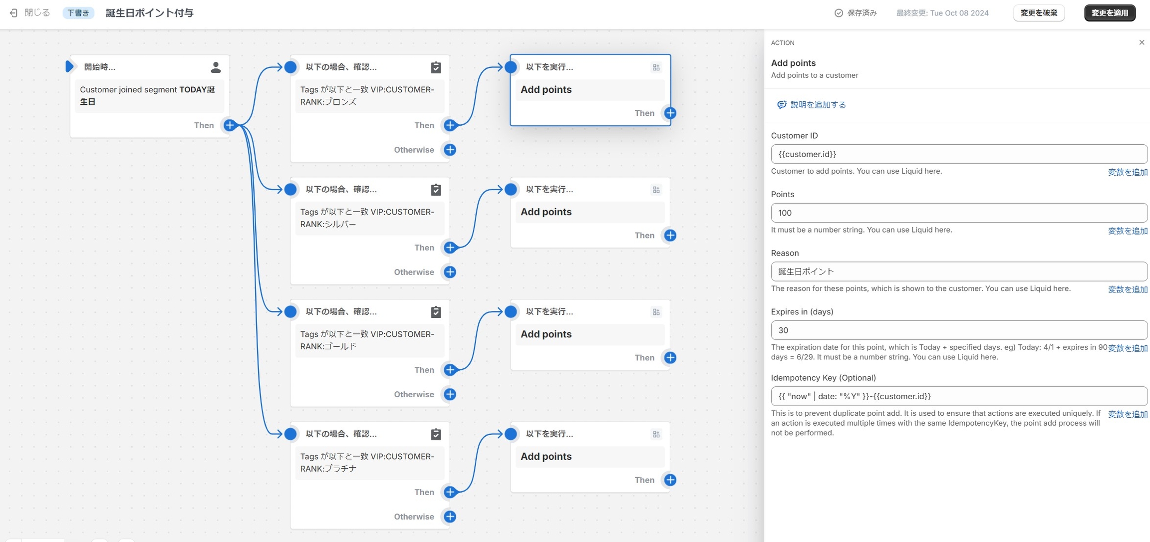 customer / tagsを選択し、VIP:CUSTOMER-RANK:{ランク名}形式でTagsをランク毎に分岐設定してください。※付与するポイントをランク別に変動させたい場合に有効です。