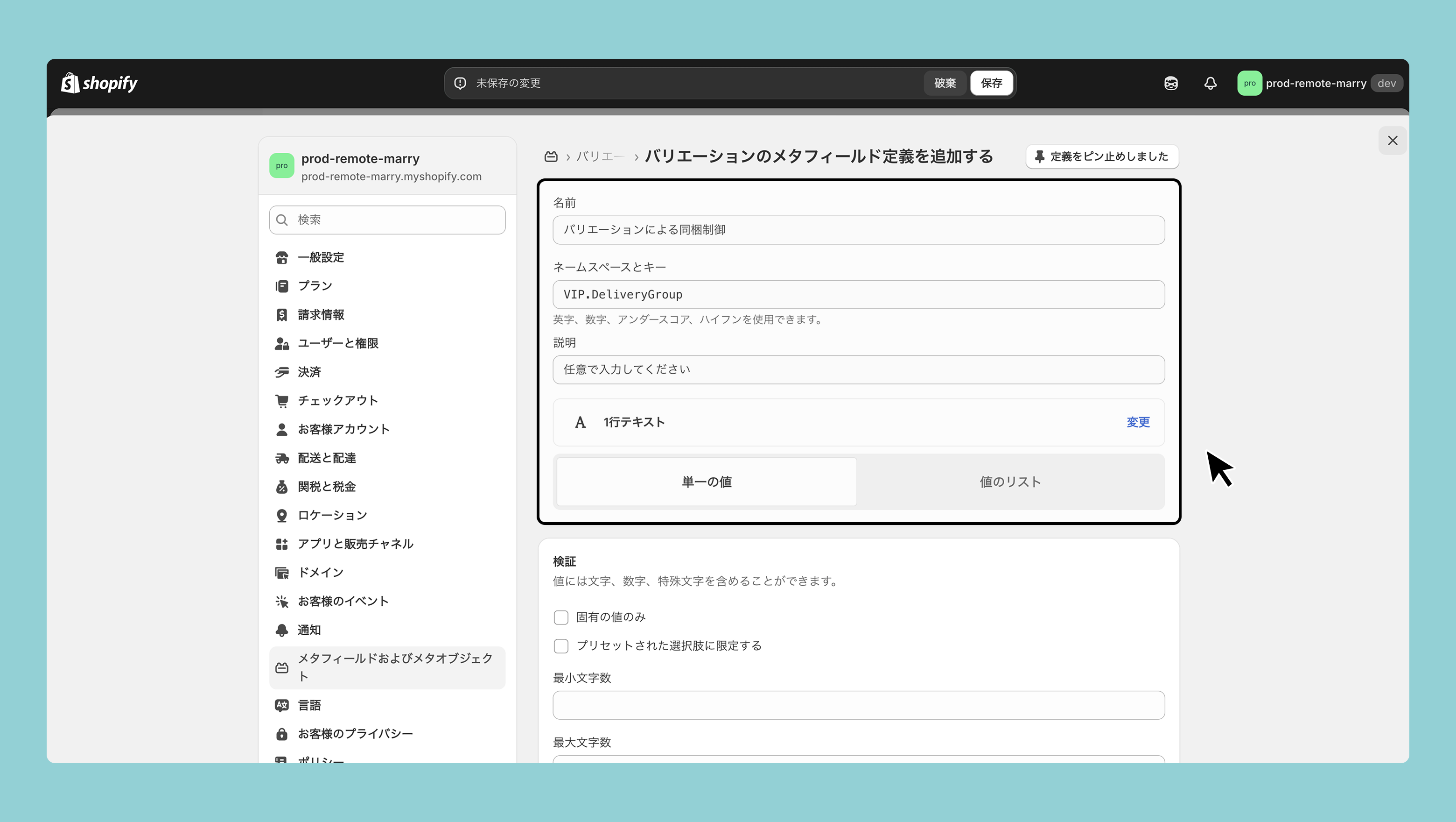 Shopify管理画面>設定>カスタムデータに進み、「バリエーション」をクリックします。次に「定義を追加する」ボタンをクリックし、各項目に下記の内容を入力してください。