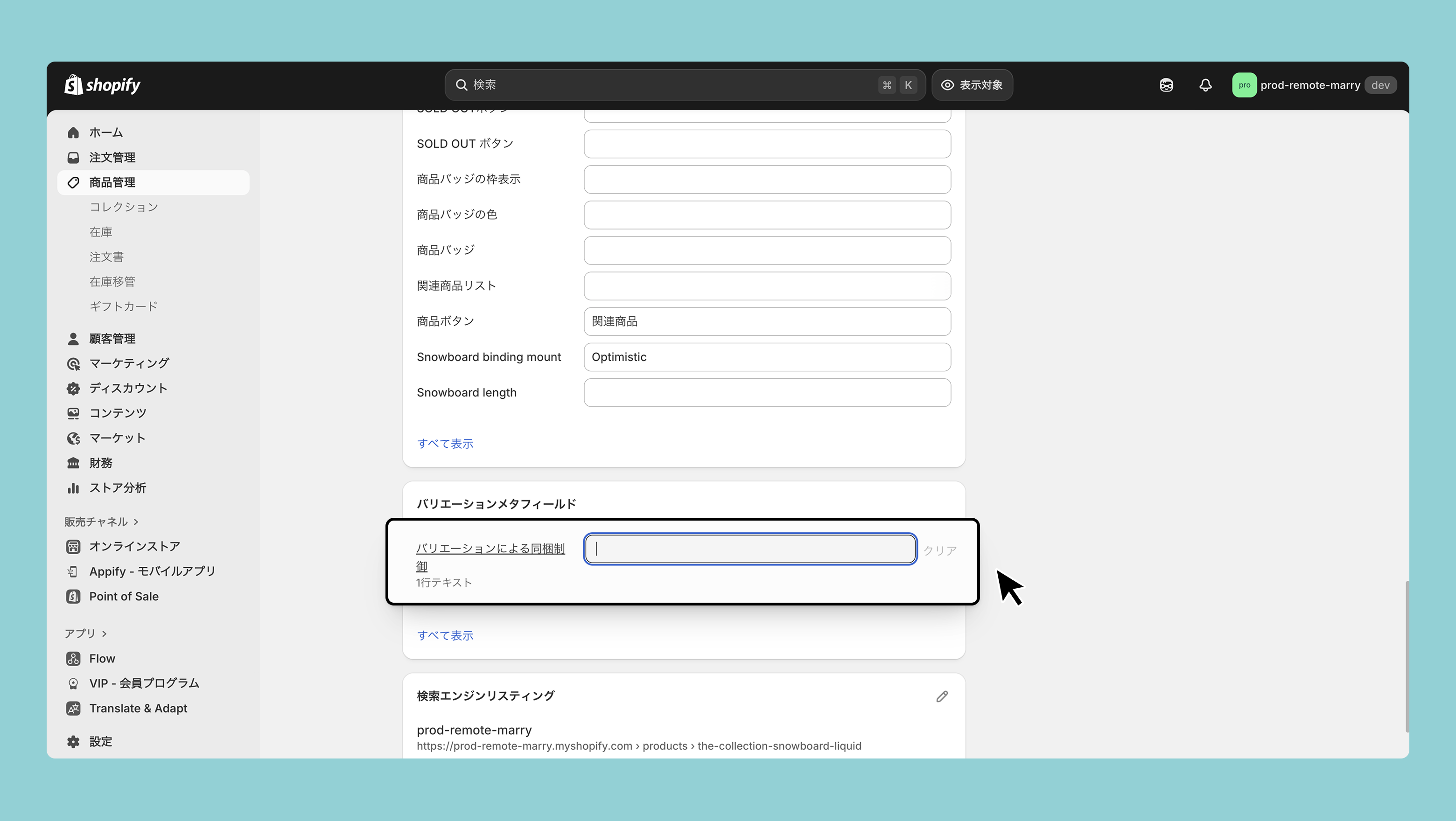 Shopifyの商品管理から対象商品を選択し、同梱制御を行いたいバリエーションの最下部までスクロールします。「バリエーションによる同梱制御」の項目に、任意の文字列(例:SS23)を入力してください。この文字列をもとに、同梱の可否が制御されます。