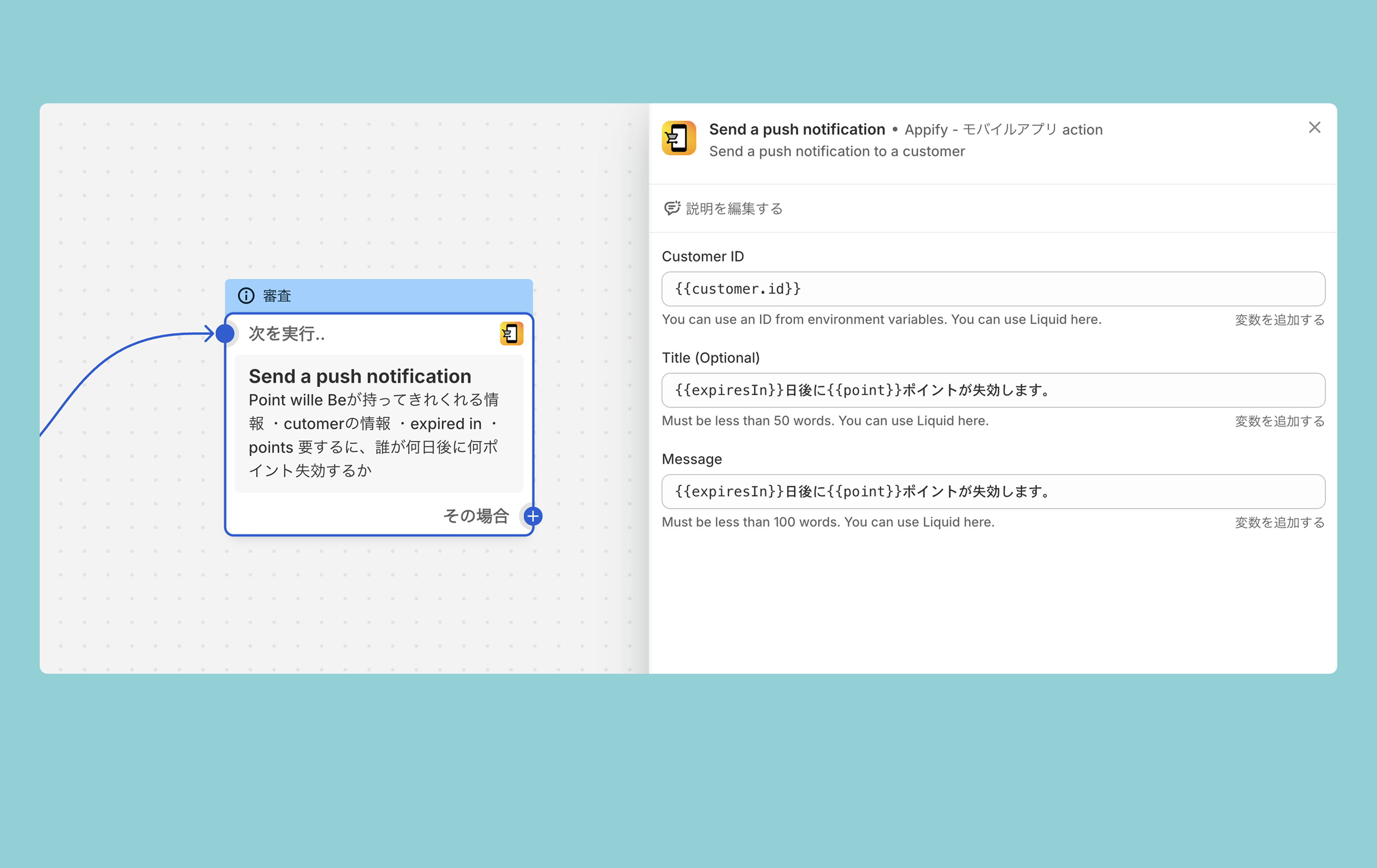 Shopify Emailの場合カスタムLiquidに対応したLiquid変数に制限があります。そのため{{expiresIn}}(失効日の〇日前の日数){{point}}(失効ポイント)などの変数は利用できません。