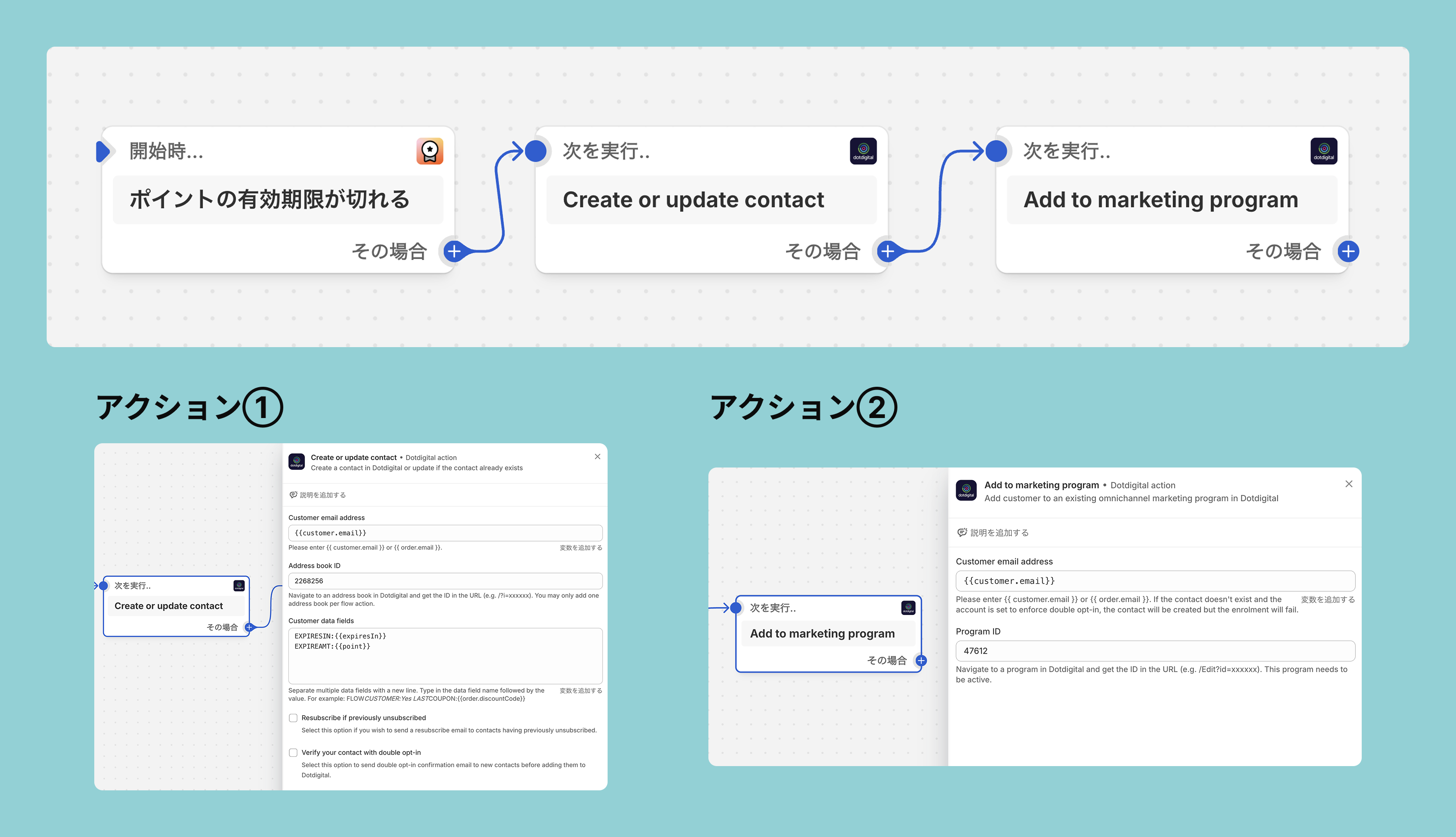 こちらの設定は、Dotdigitalに失効を通知するためのイベント情報を送る設定です。実際にメールを送るためには追加でDotdigital側での設定が必要です。詳しい設定は、Dotdigitalにご確認ください。