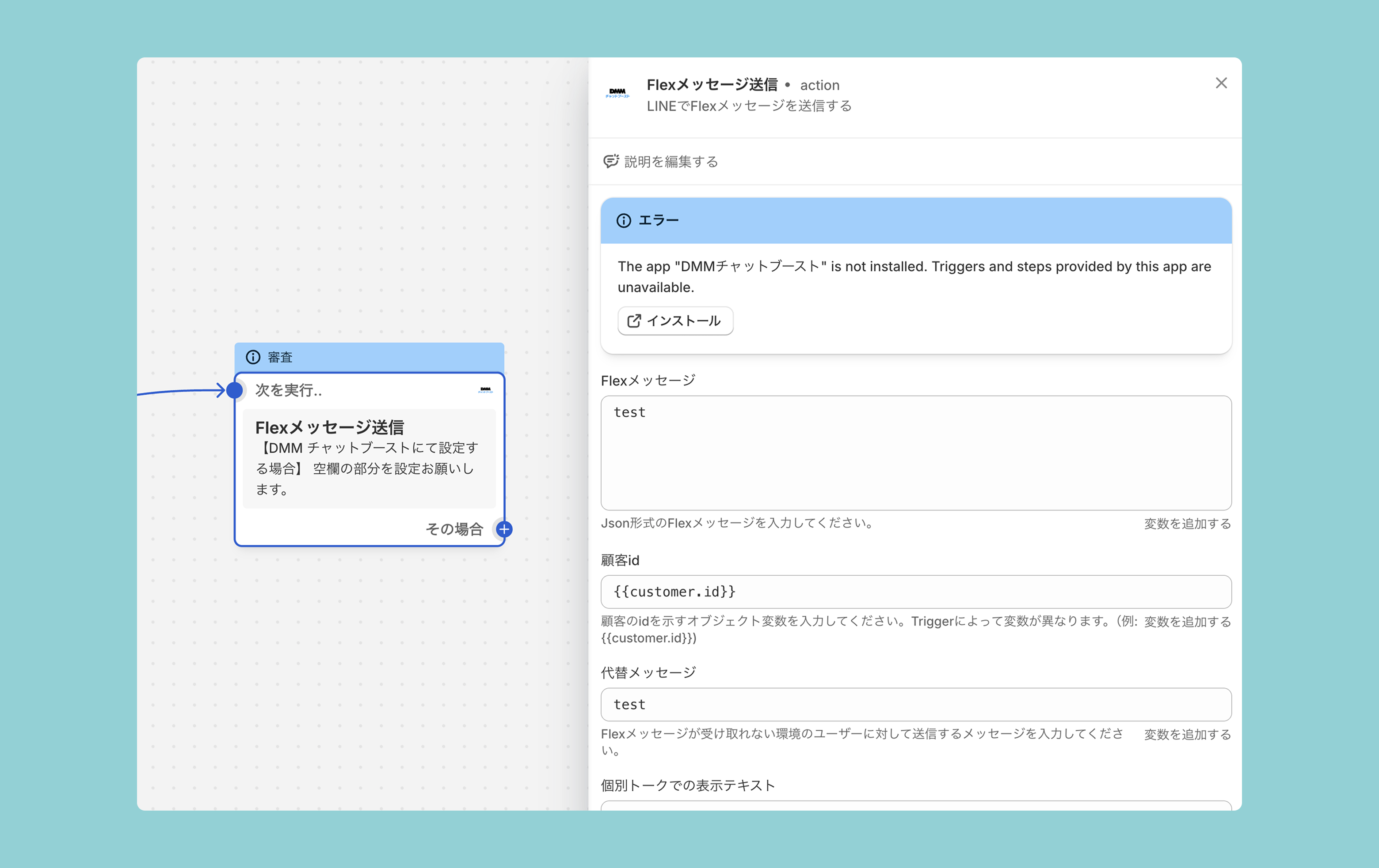 アクションにて「LINEでFlexメッセージを送る」を選択します。