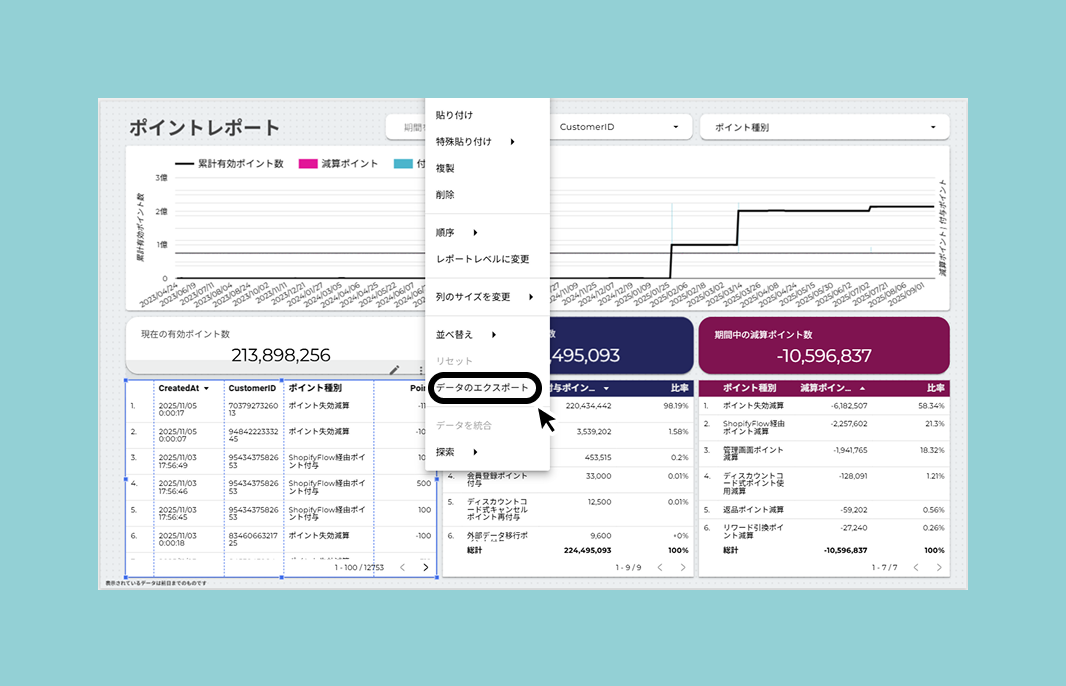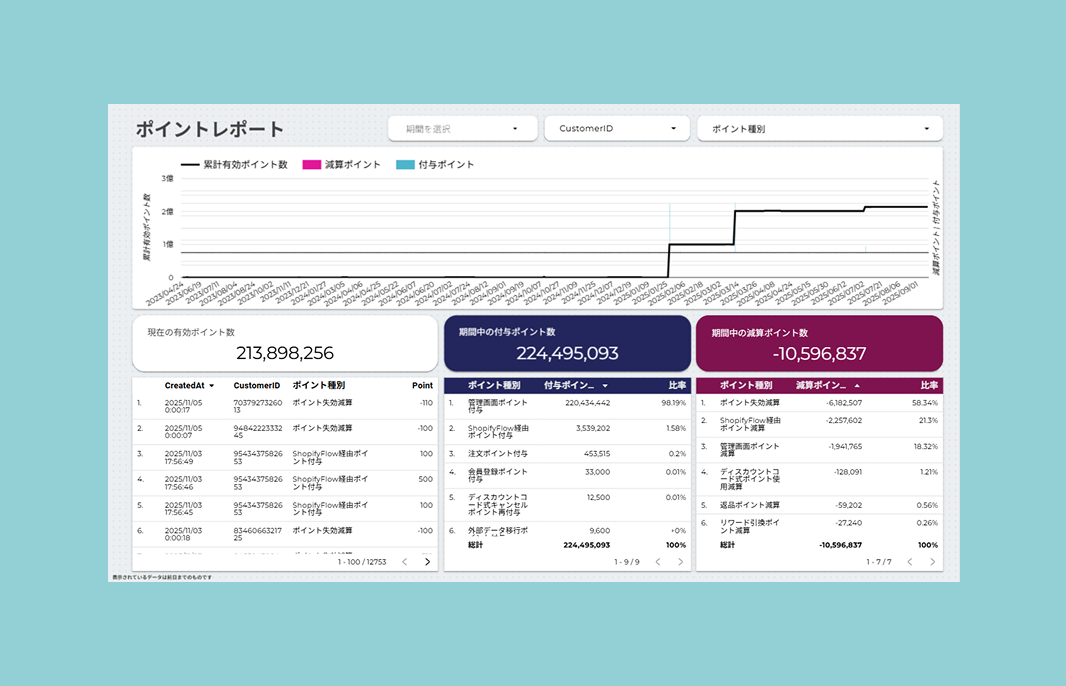 レポート上には、累計有効ポイント数・付与ポイント・減算ポイントなどのデータが表示されます。