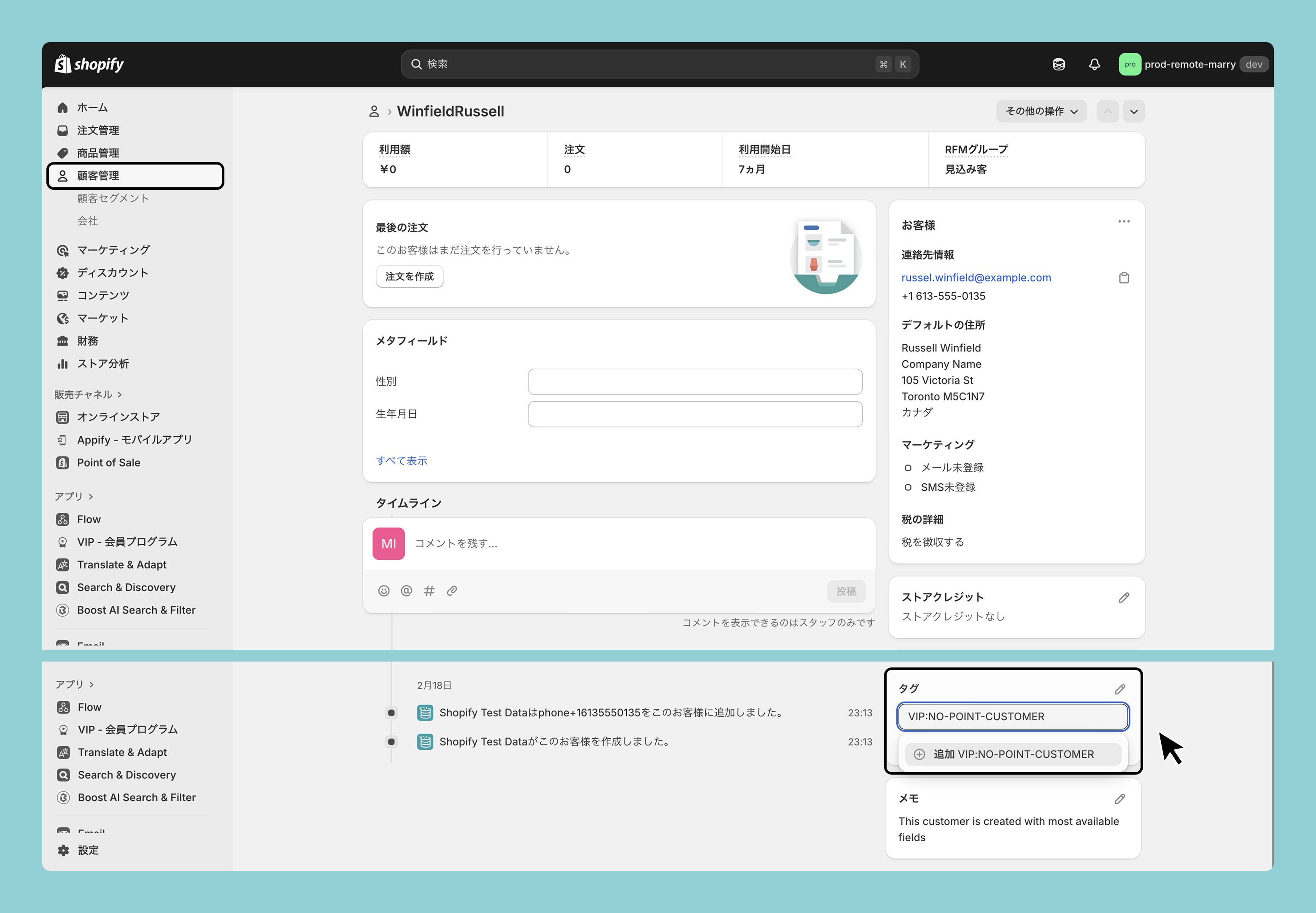 Shopifyの管理画面>顧客管理>ポイント付与の対象外にしたいお客様をクリック>タグにて、「VIP:NO-POINT-CUSTOMER」を設定します。