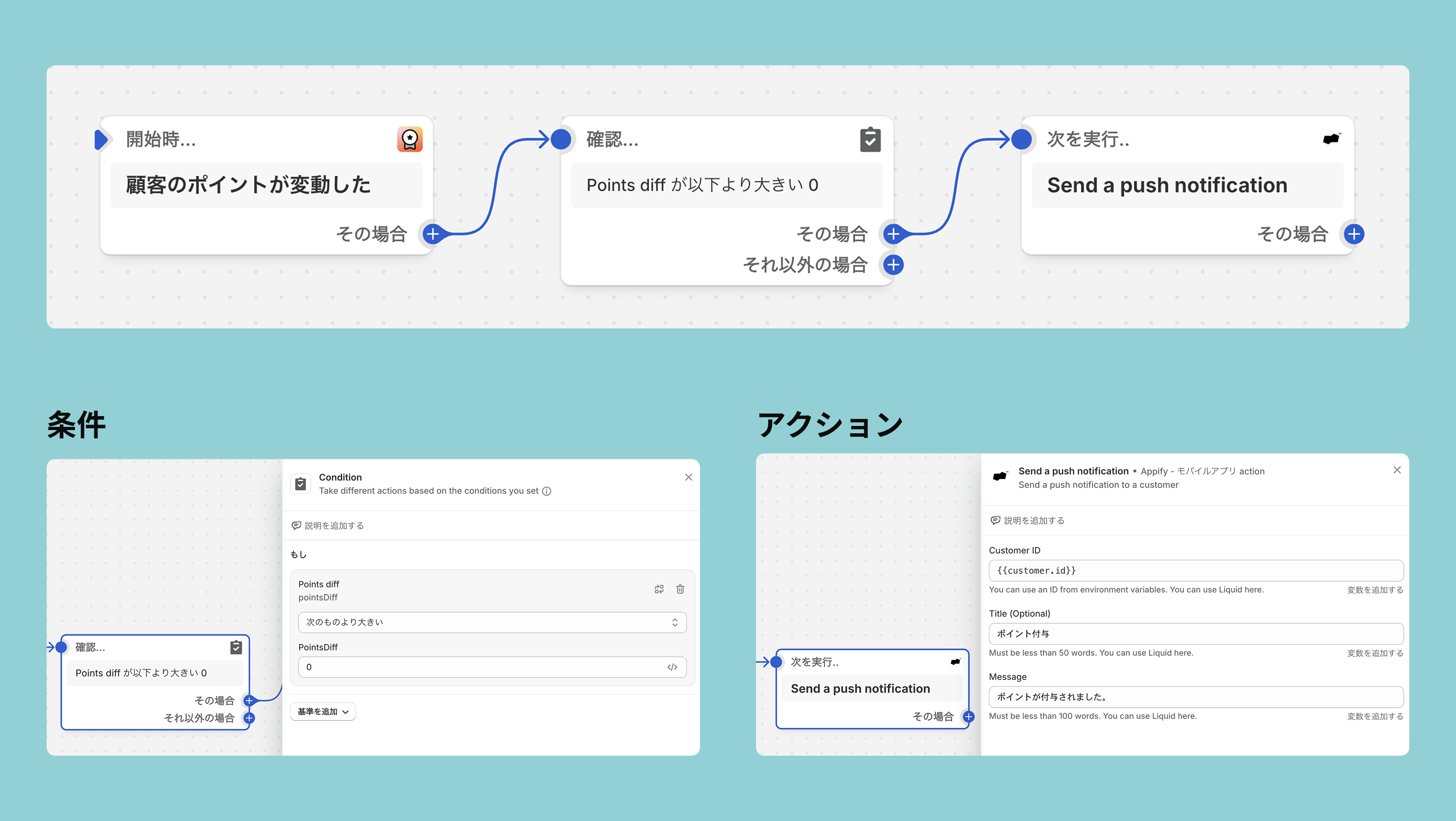 ポイントが付与されたことを、Appifyのプッシュ通知や、CRM PLUS、Klaviyoなどで通知することが可能です。