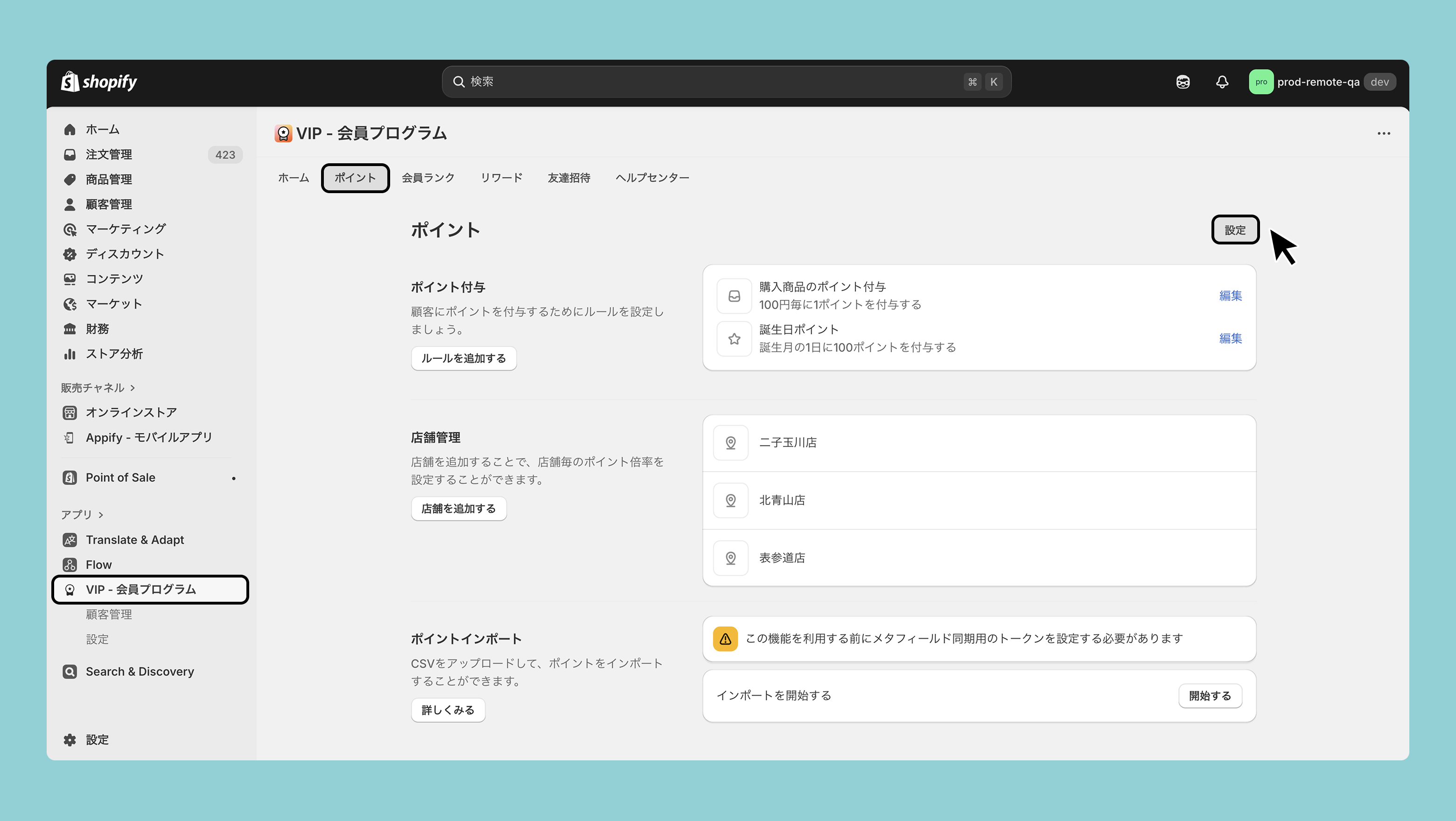 VIP管理画面>ポイント>ポイント付与>設定をクリックします。