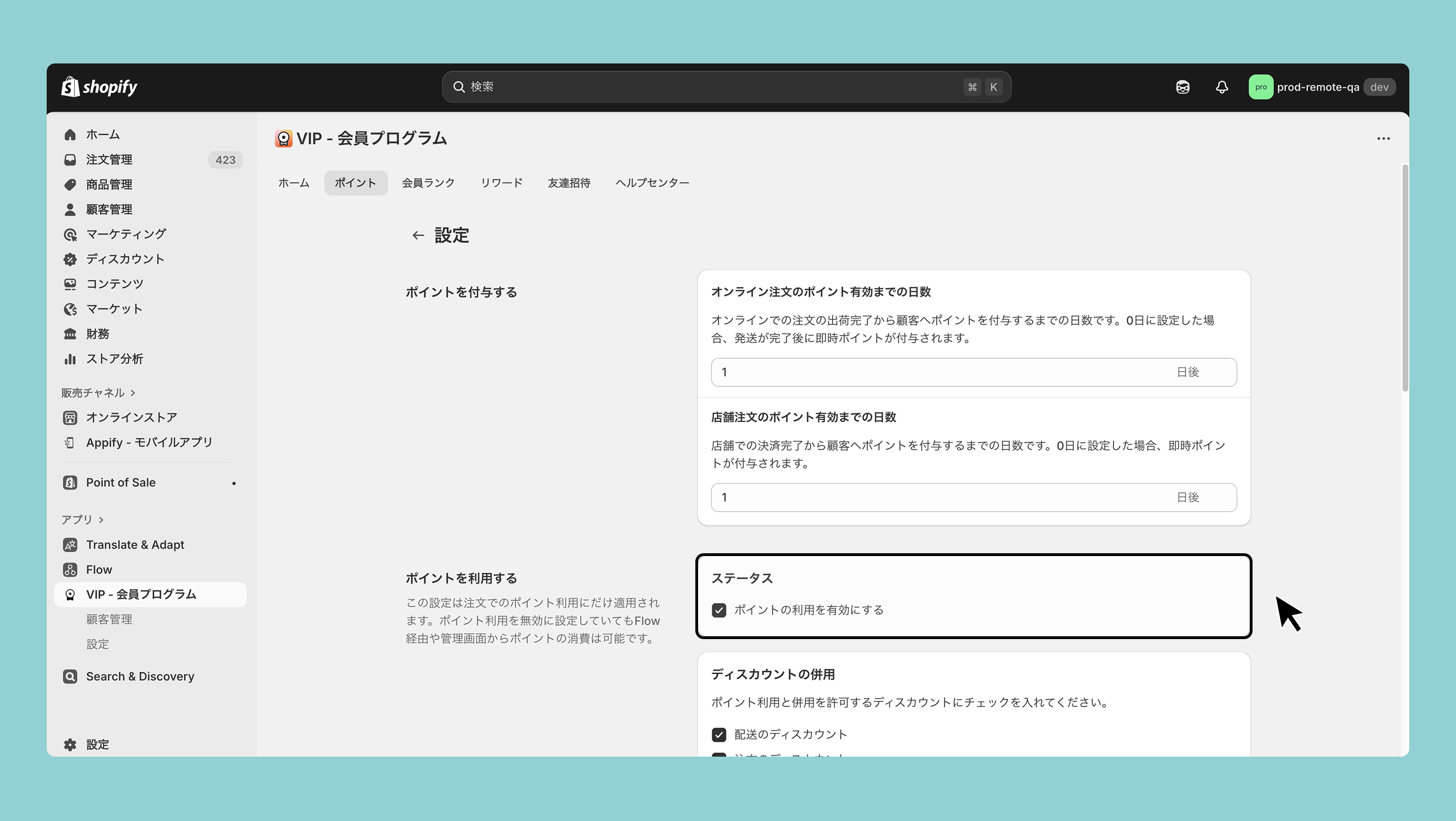 ポイント利用を有効にする場合、ポイントを利用する>ステータス>ポイントの利用を有効にするにチェックしてください。