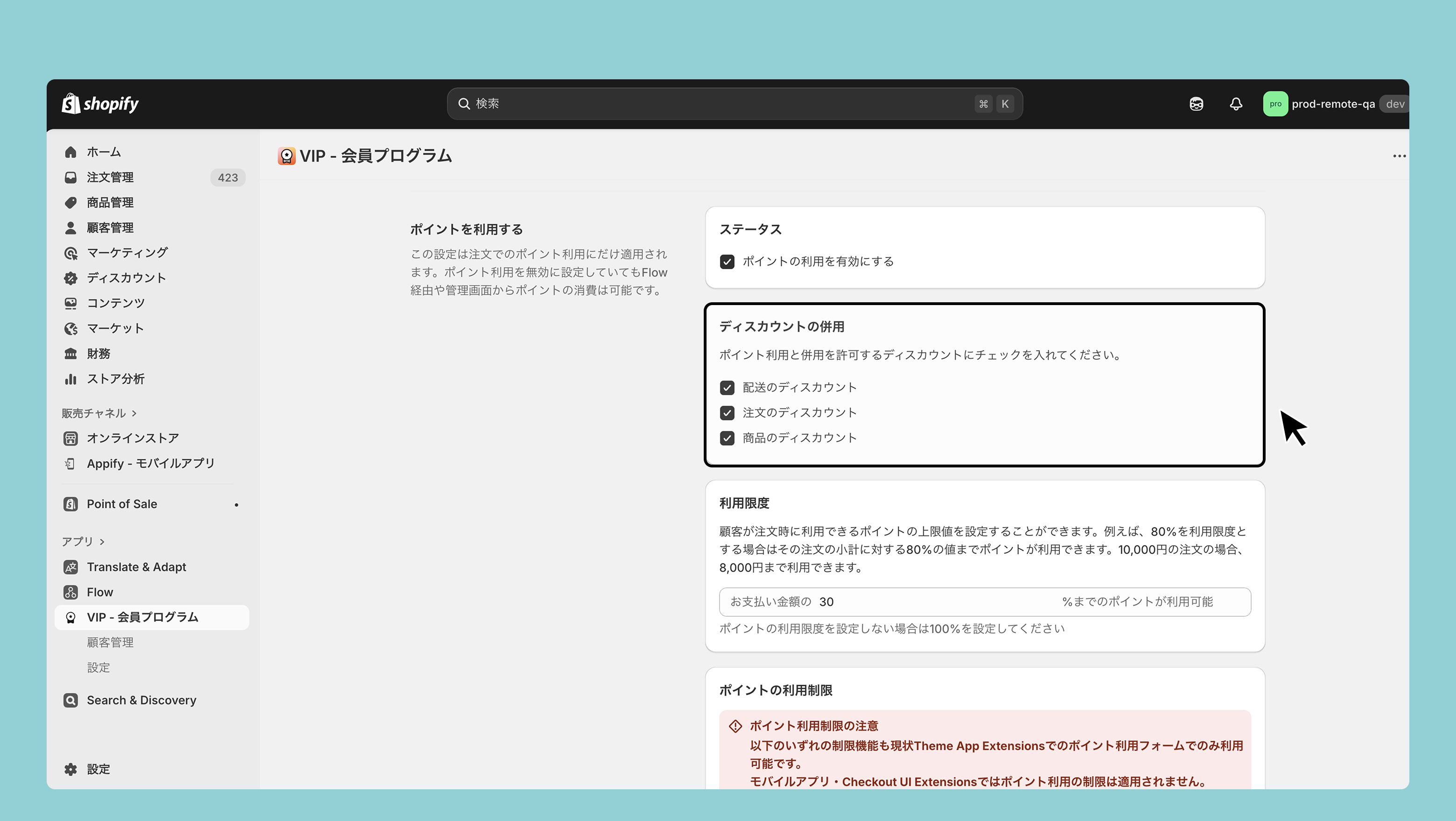 ポイント利用を無効に設定していても、Shopify Flow経由や管理画面からポイントの消費は可能です。