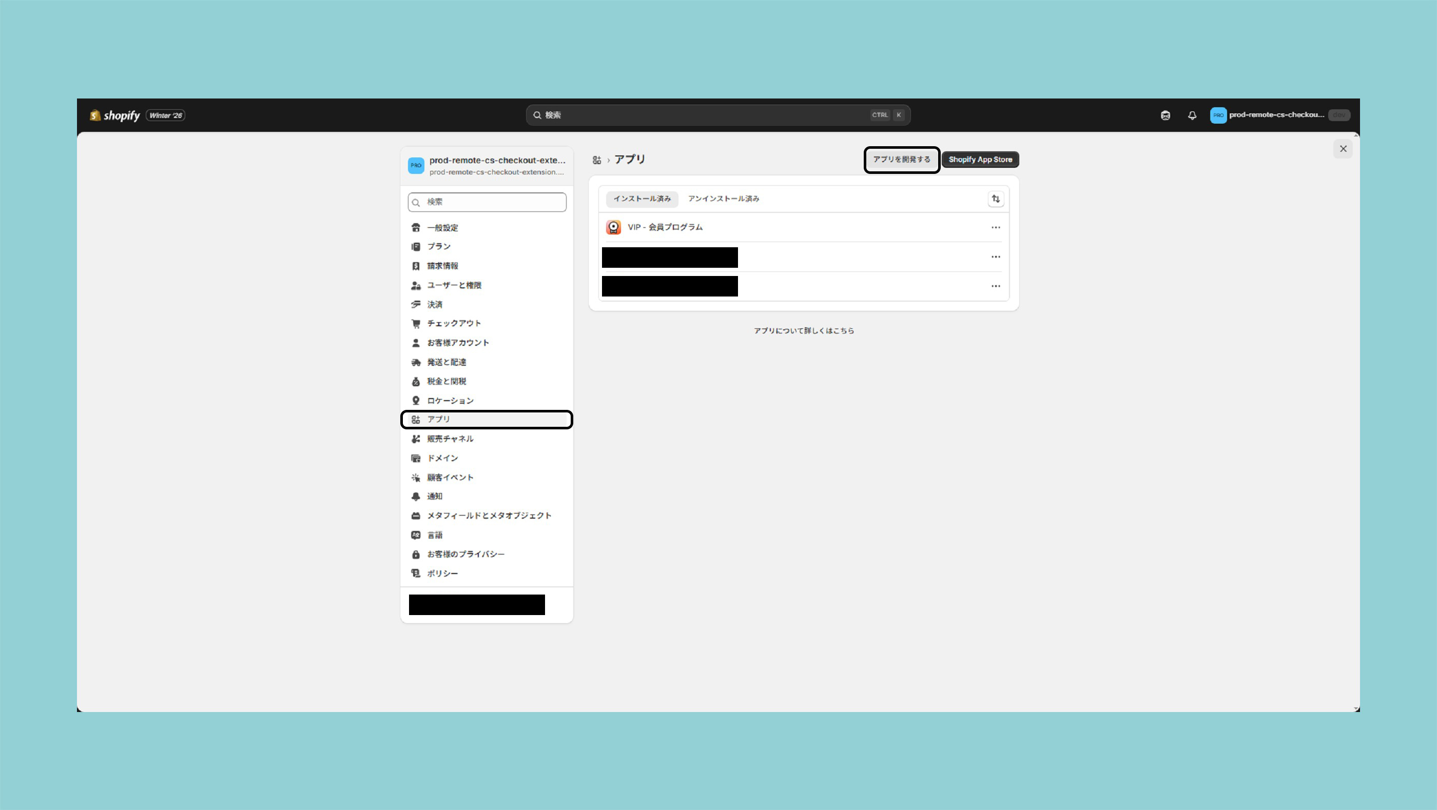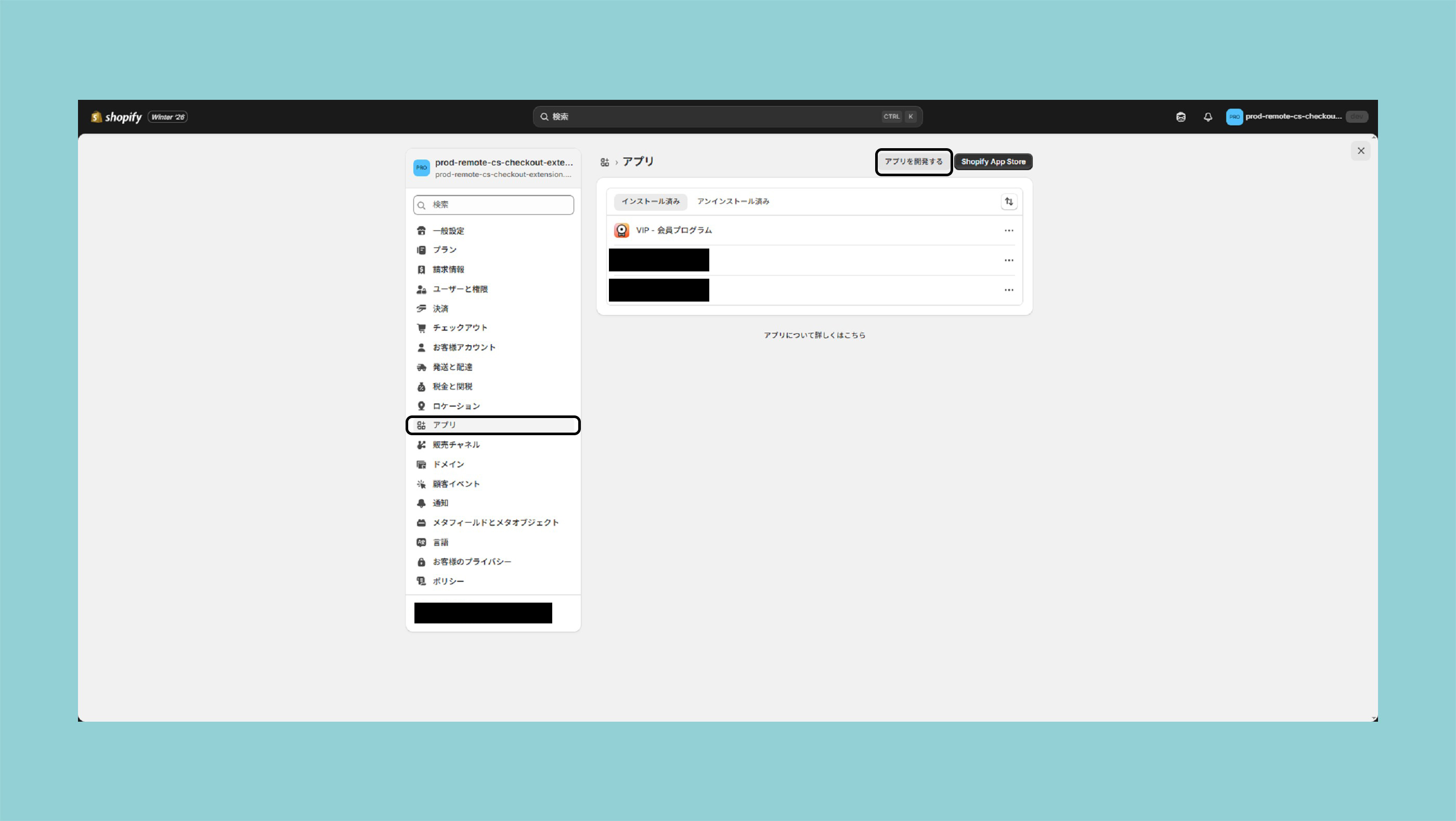 Shopify管理画面より設定 > アプリ>アプリを開発の順に操作してください。