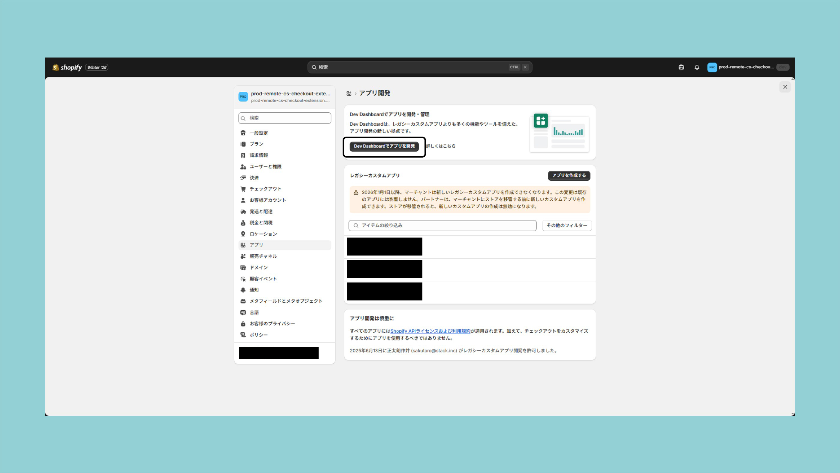 Shopify管理画面より設定 > アプリ>アプリを開発の順に操作し、「Dev Dashboardでアプリを開発」ボタンをクリックしてください。
