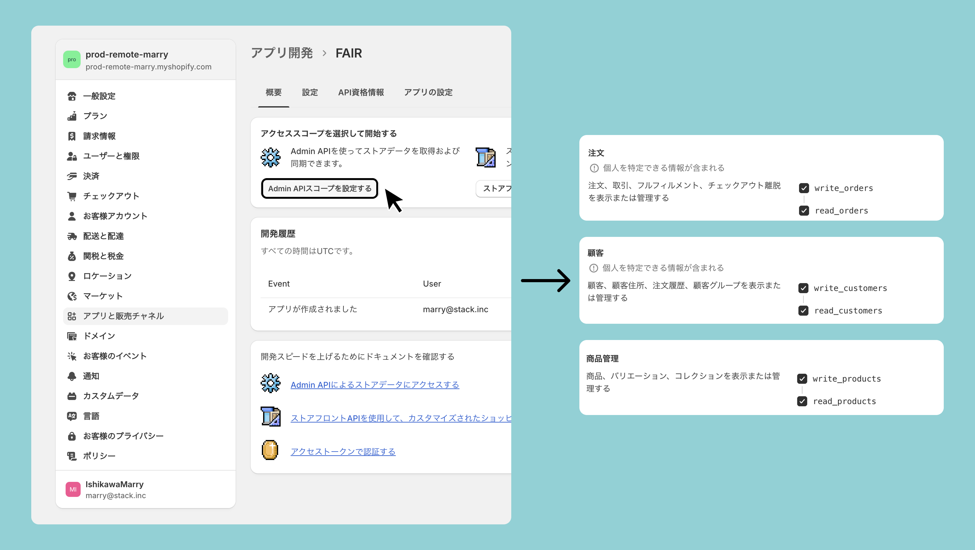 先ほど作成したアプリを選択し、概要タブの 「Admin APIスコープを設定する」から、以下の2つのAdmin APIアクセススコープを選択してください。
