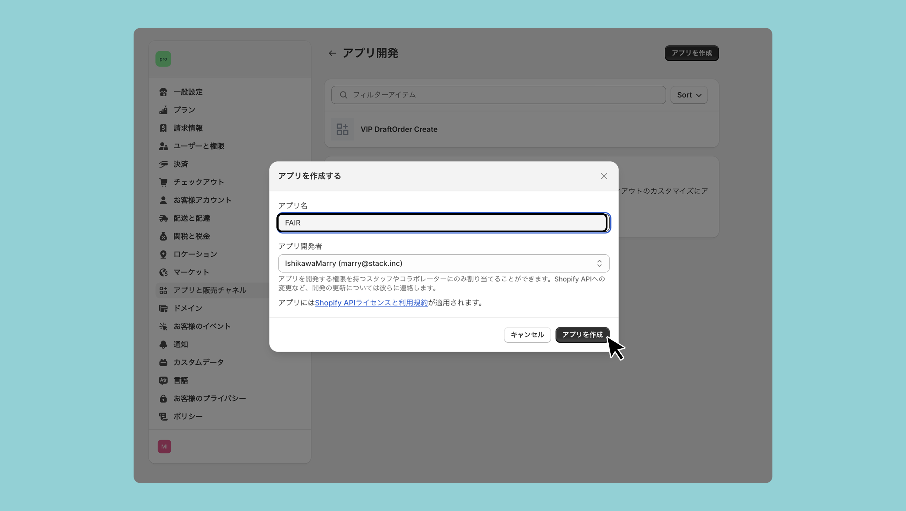その次に右上の「アプリ作成」から、アプリ名に「VIP DraftOrder Create」と入力し右上の「アプリを作成」ボタンをクリックしてください。
