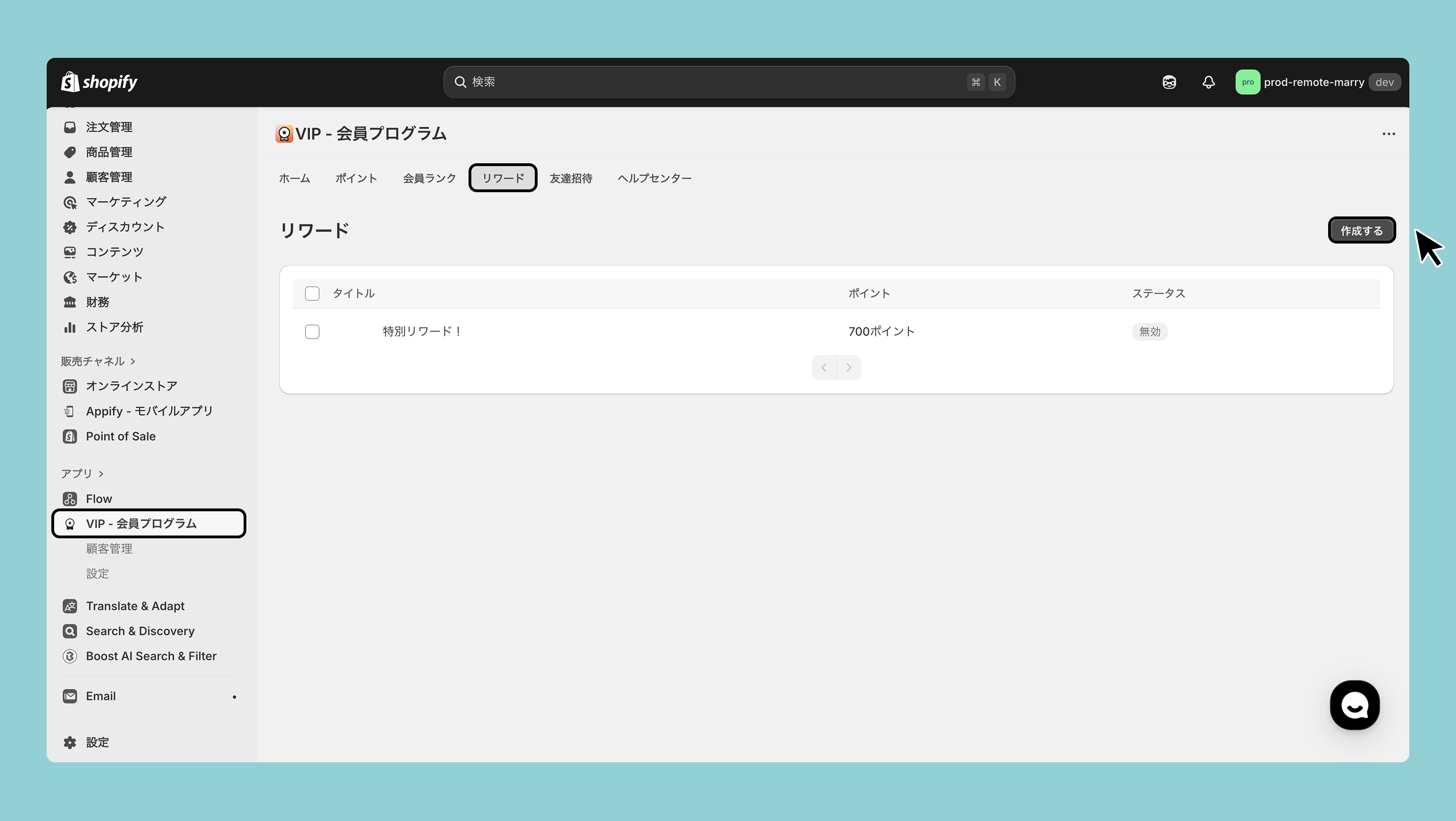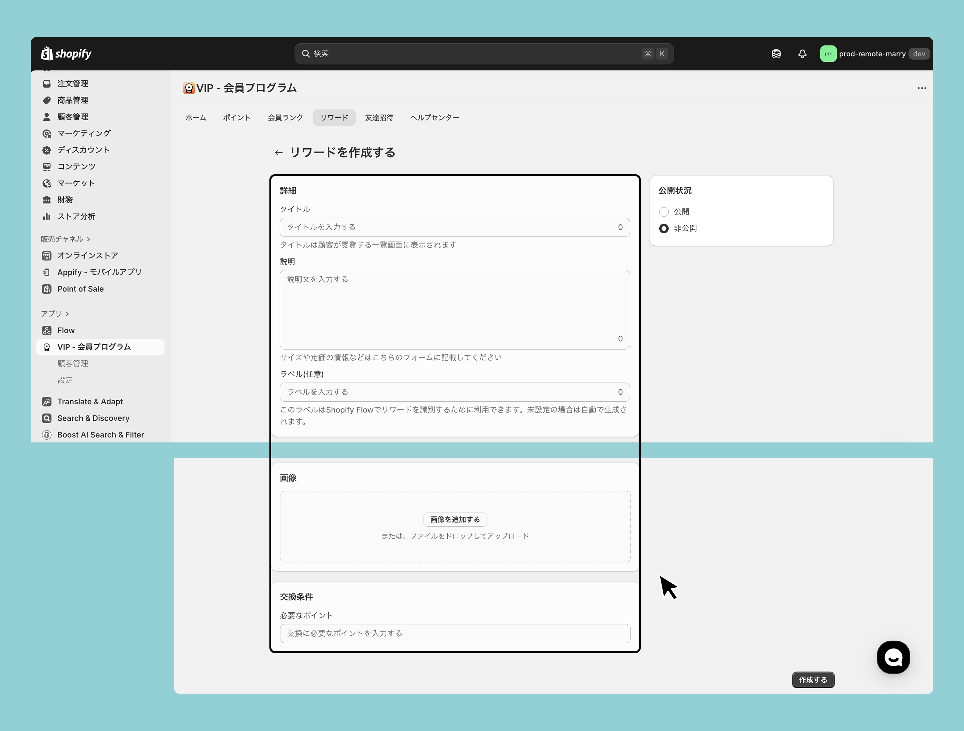 VIP管理画面で、各項目を設定することでポイントで交換できるリワードを登録します。