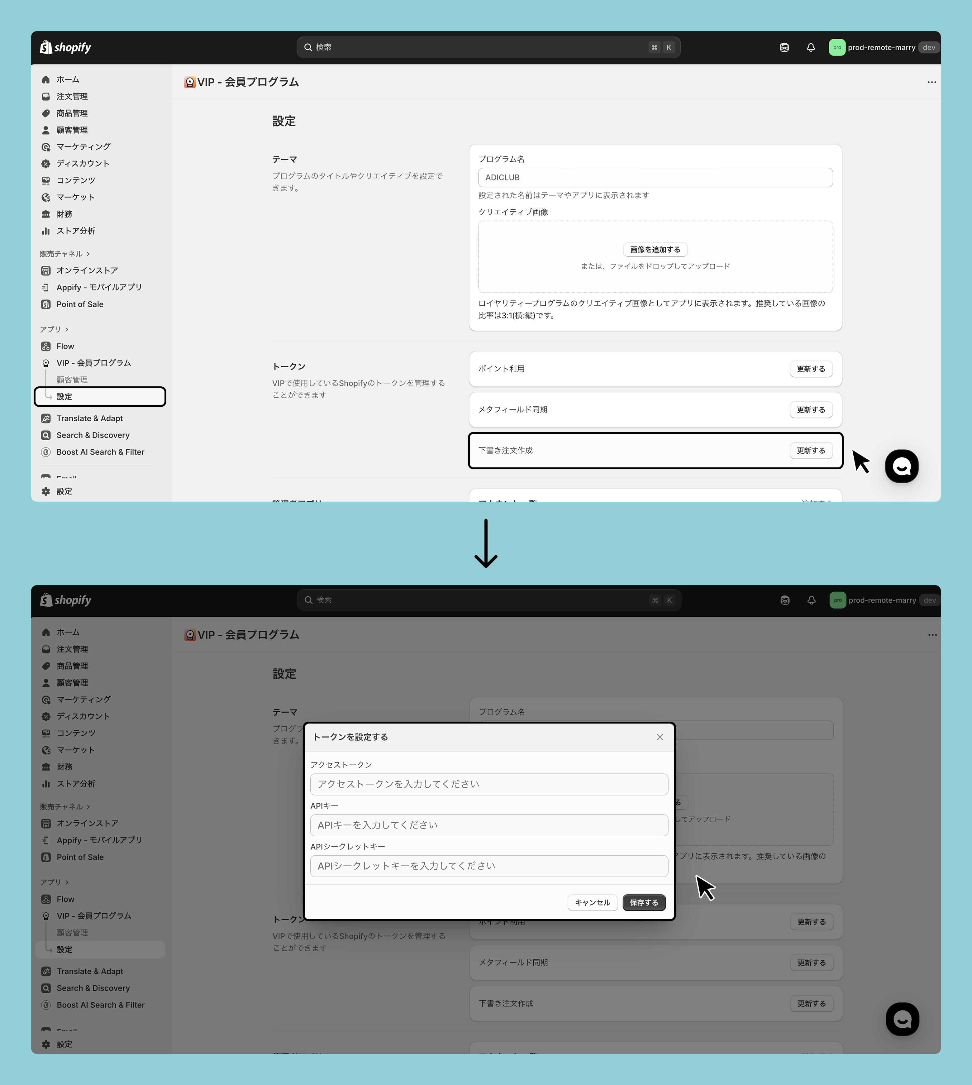 VIP管理画面に>設定>Shopifyアクセストークン>下書き注文作成>設定するをクリックします。