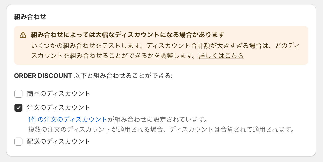 併用したい側のディスカウントコードの設定を開き、注文のディスカウントにチェックを入れます。
