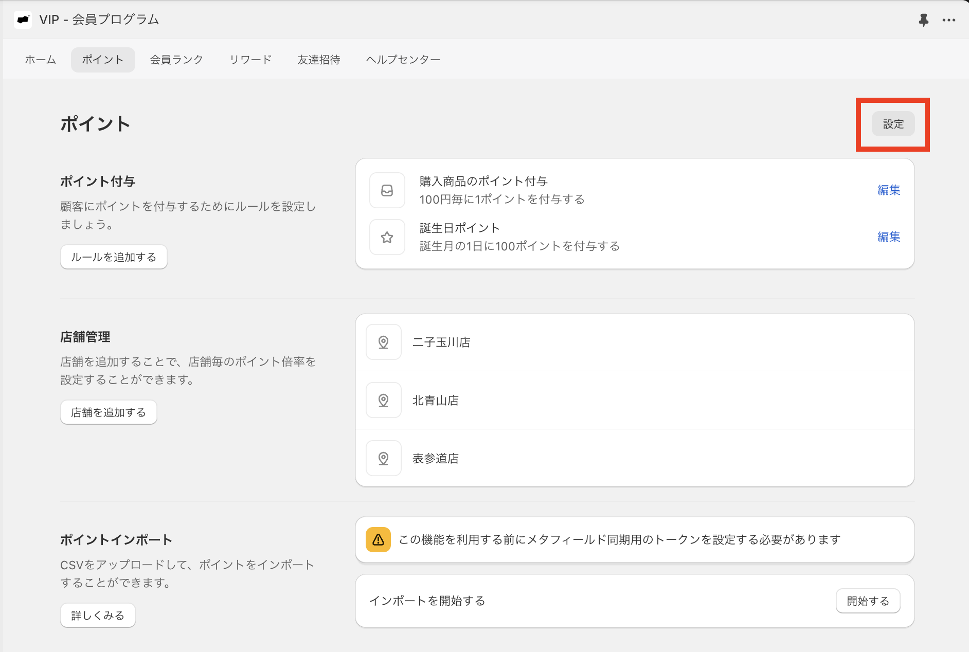 VIP管理画面 > ポイント > 右上の設定 と進みます。