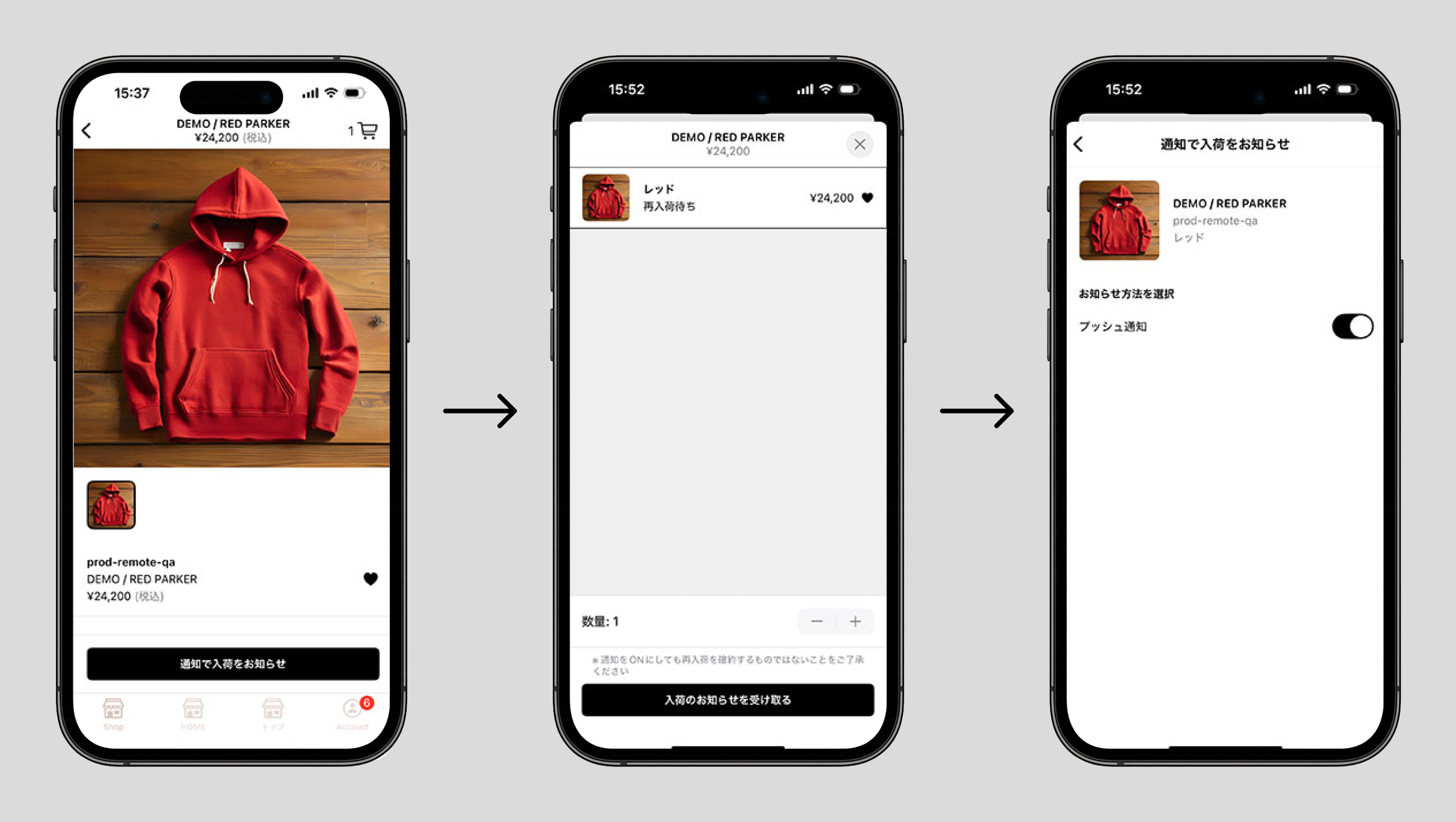商品が在庫切れもしくは選択したバリエーションが在庫切れの場合に、顧客が再入荷通知の受け取り登録をできるようにします。