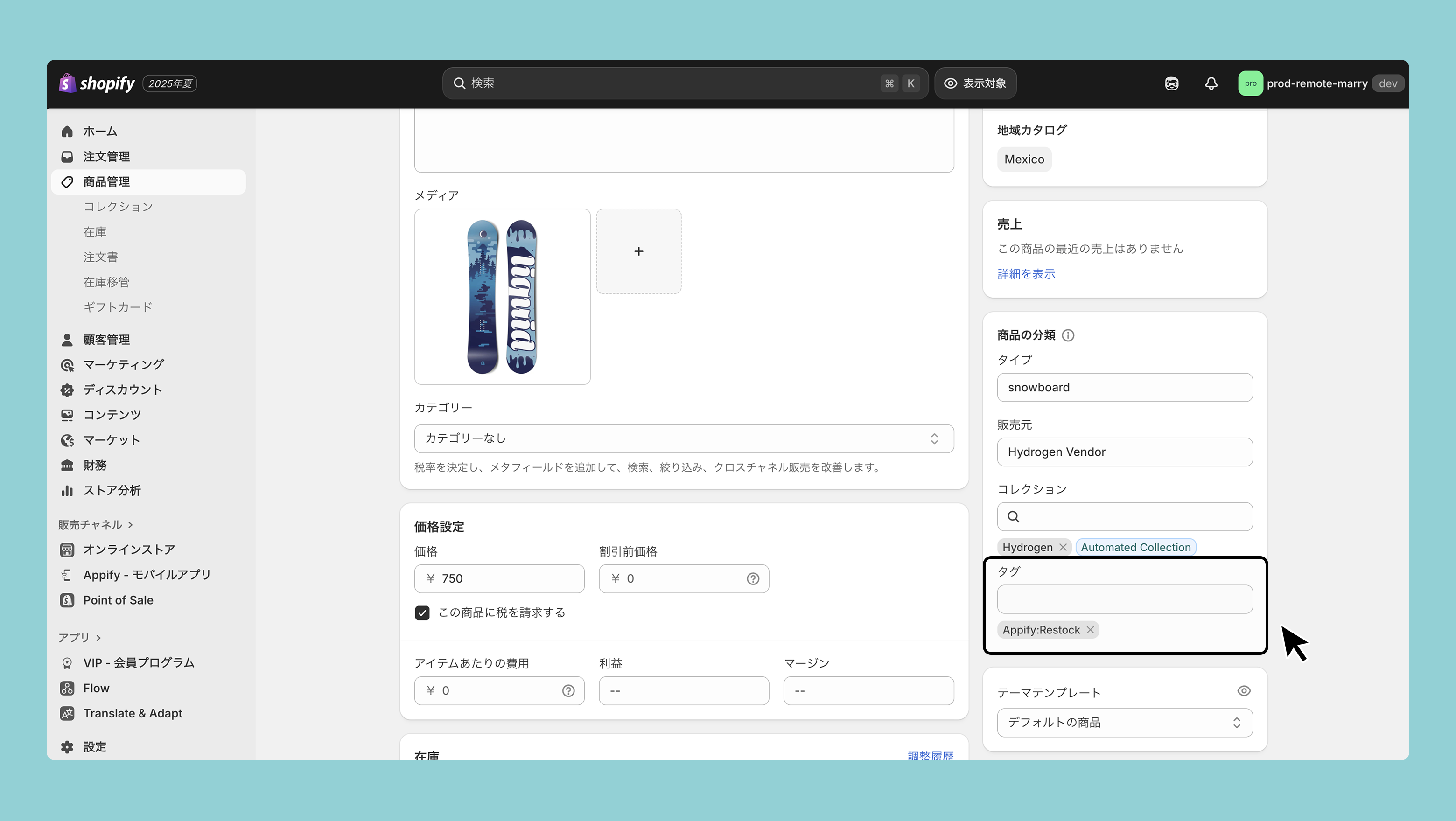 Shopify管理画面>商品管理>再入荷通知を受け取るボタンを表示したい商品>タグに「Appify:Restock」を商品タグに設定することで、再入荷通知を受け取るボタンを表示することができます。
