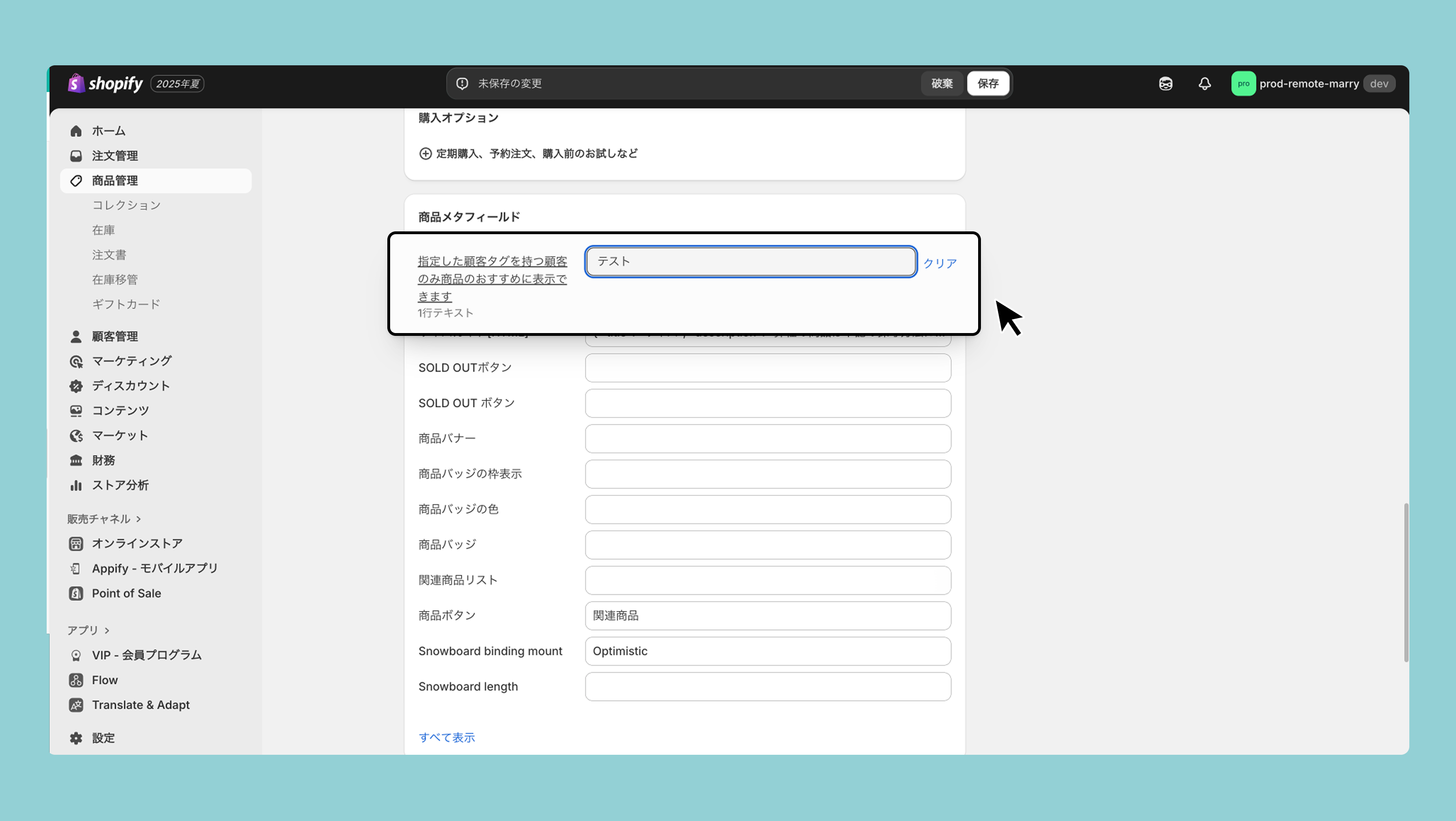 Shopify管理画面>商品管理>特定の顧客にのみに表示したい商品をクリック>メタフィールド>商品メタフィールドから設定します。