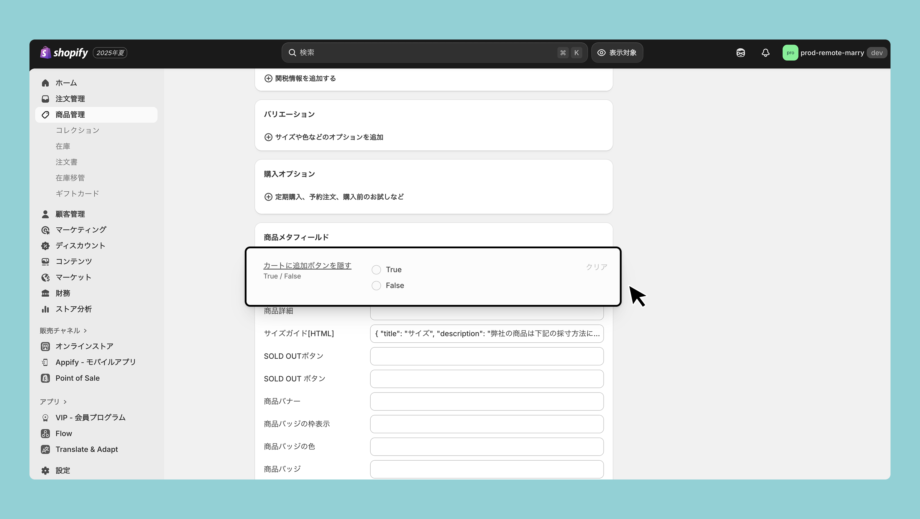 Shopify管理画面>商品管理>カート追加ボタンを非表示にしたい商品をクリック>メタフィールド>商品メタフィールドから設定します。