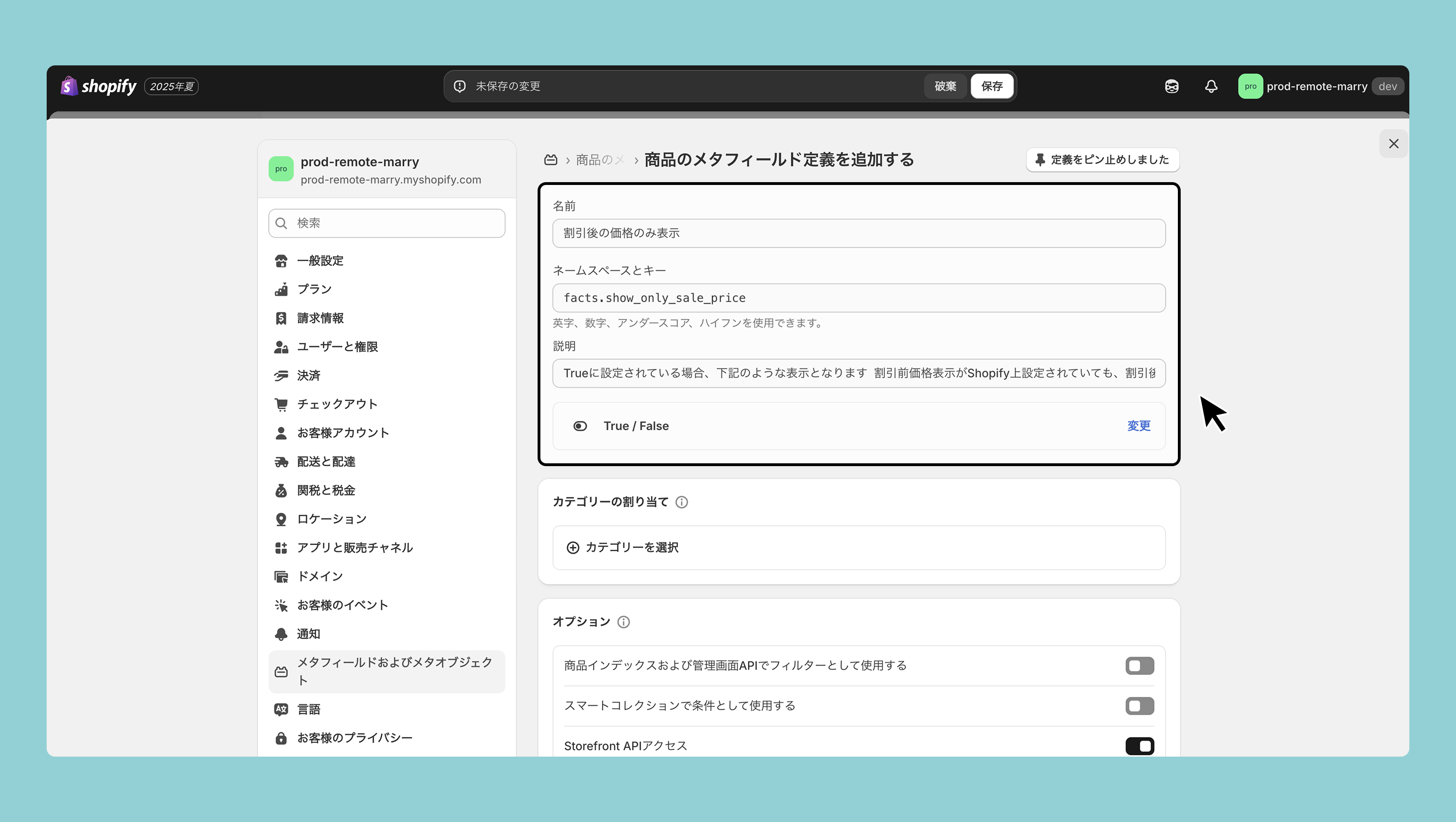 Shopify管理画面>設定>メタフィールドとメタオブジェクト>商品>定義を追加するから設定を行います。