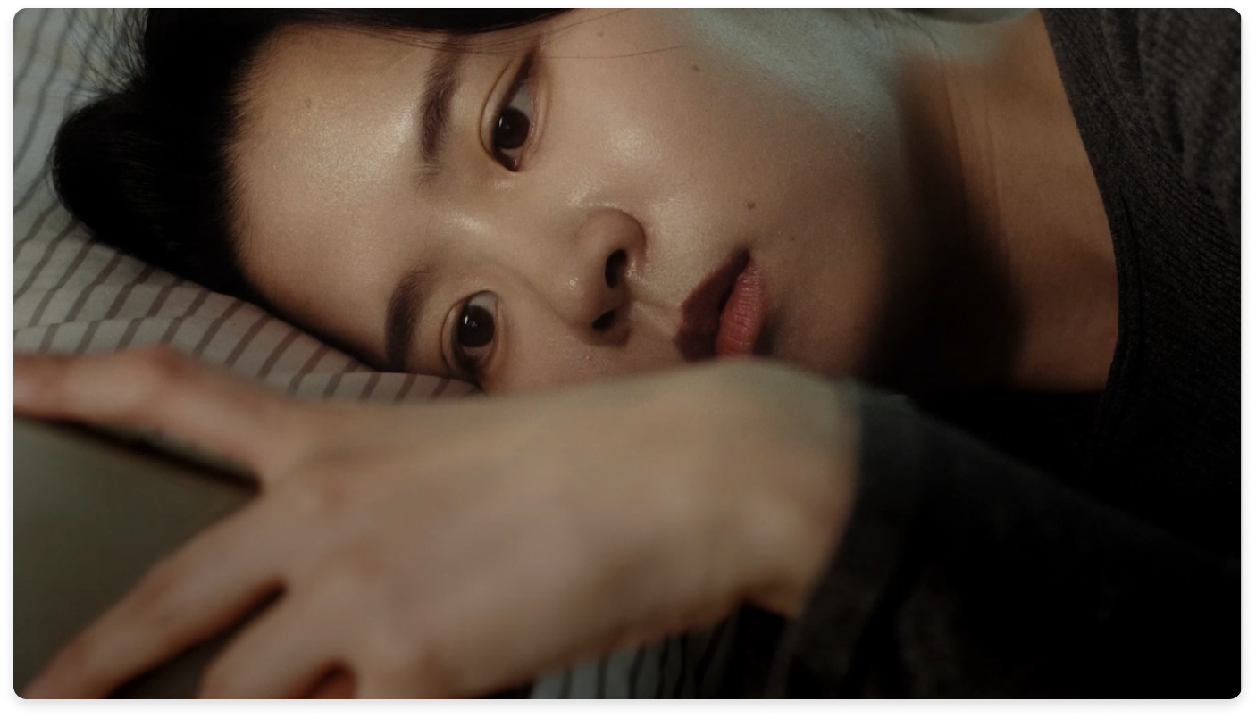 침대에 누워 휴대폰을 사용하는 사람