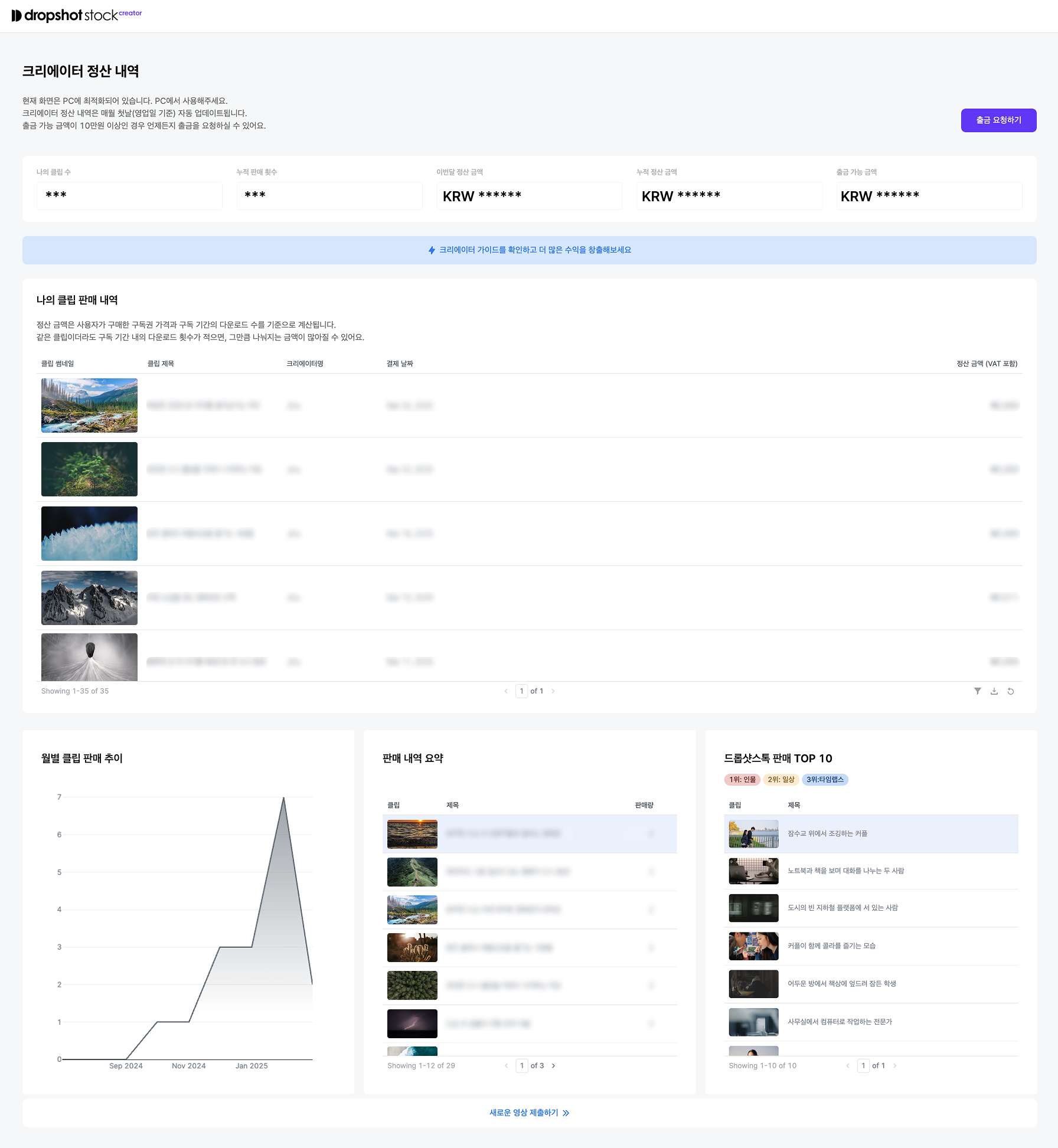 드롭샷스톡에서는 크리에이터님이 판매한 클립에 대해 로열티 시스템으로 수익을 함께 나누고 있어요. 로열티율은 크리에이터 프로필 페이지에서 언제든지 확인하실 수 있고,