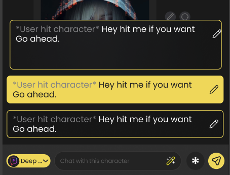 Use asterisks (*like this*) to write thoughts or actions — for yourself or the character.
