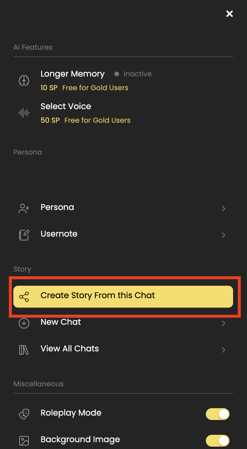 1. Open the side menu and click Create Story From This Chat.