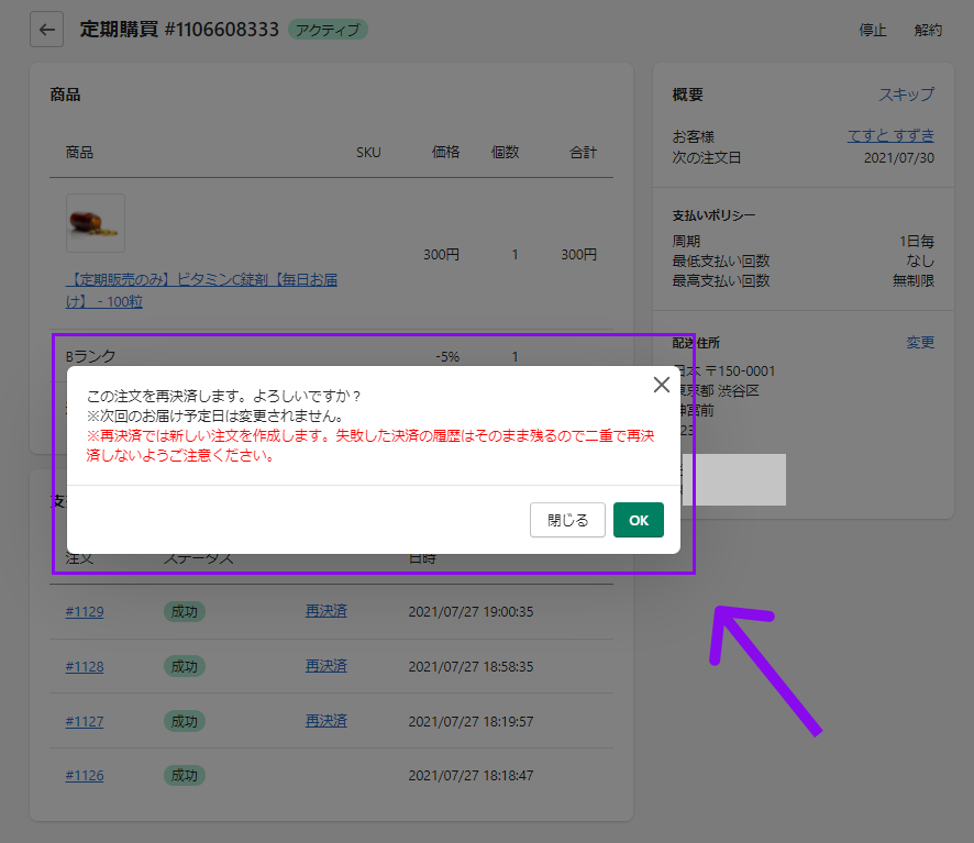 最大購入数、最小購入数を設定している場合はこの「再決済」の決済もカウントされます。