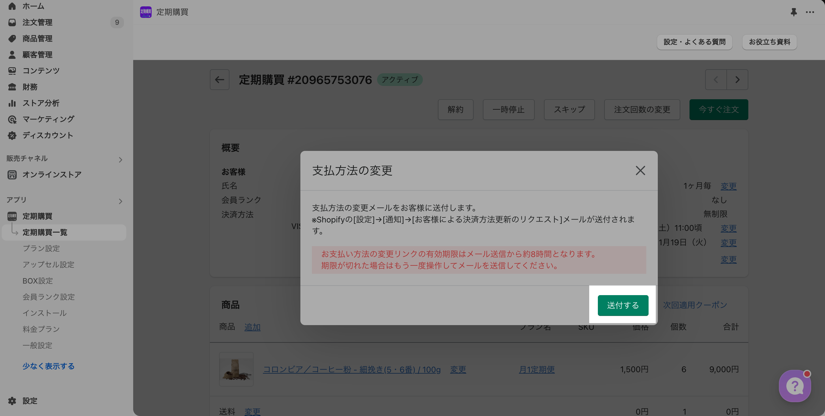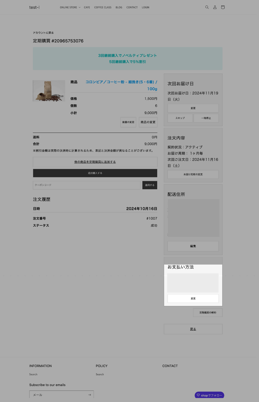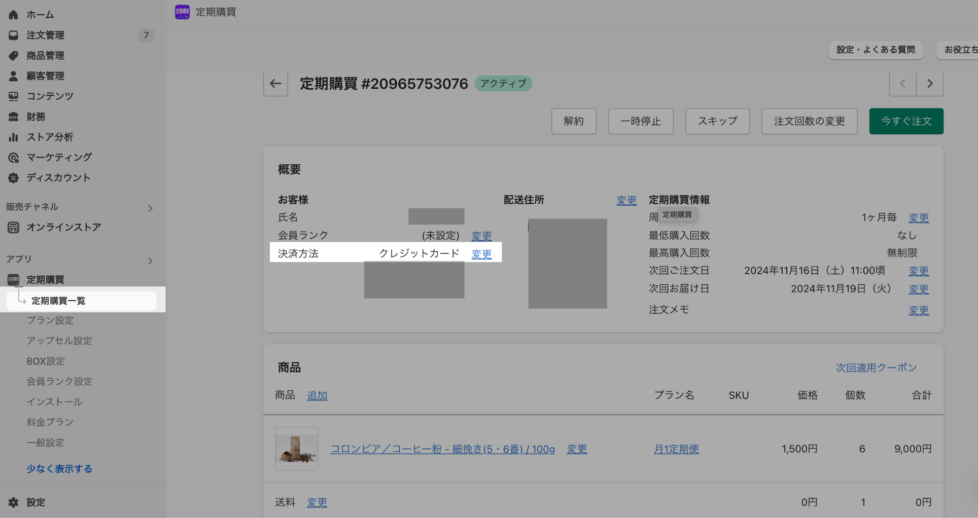 「定期購買一覧」より、該当の契約を開き「決済方法」の横にある