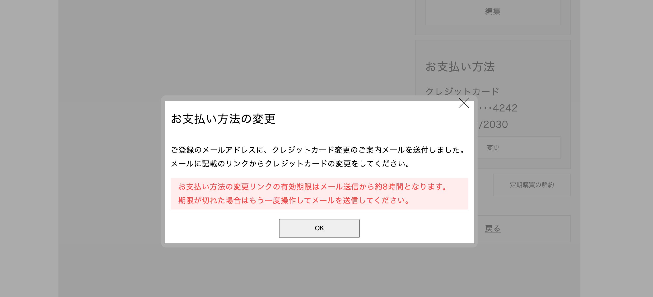 EXPIRED_PAYMENT_METHOD | 〃 | エラー(お支払い方法の有効期限が切れています。) | 失敗理由 |お支払い方法の有効期限が切れています。ショップのマイページ{お支払い方法の変更}より新しいカードを登録してショップまでご連絡ください。 |