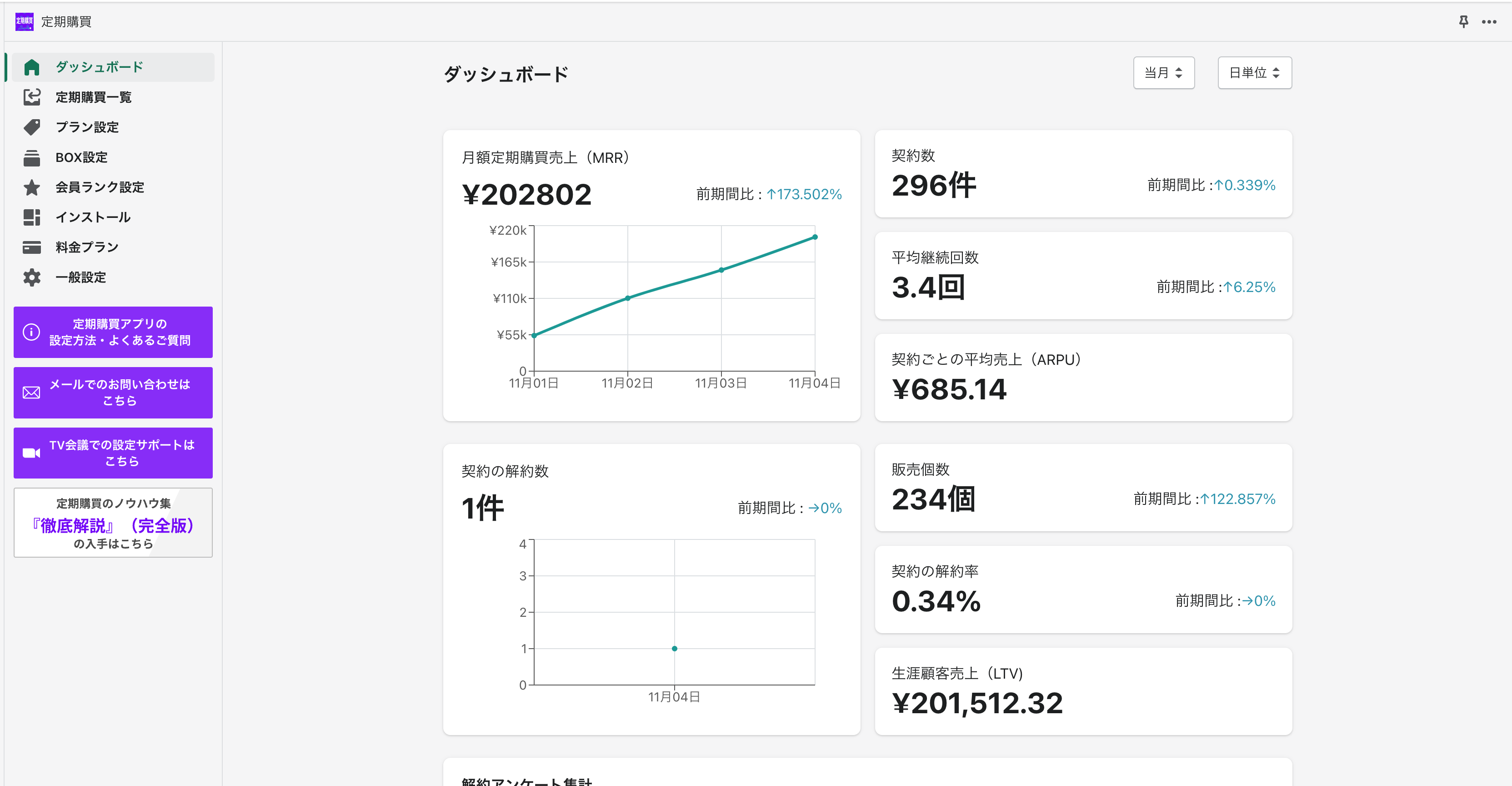 月額定期購買売上(MRR) | ¥ | 指定期間の定期購買売上 | 指定期間に発生した定期購買売上 ※テストモードでの注文や注文キャンセル、一部返品などは加味してません。 |