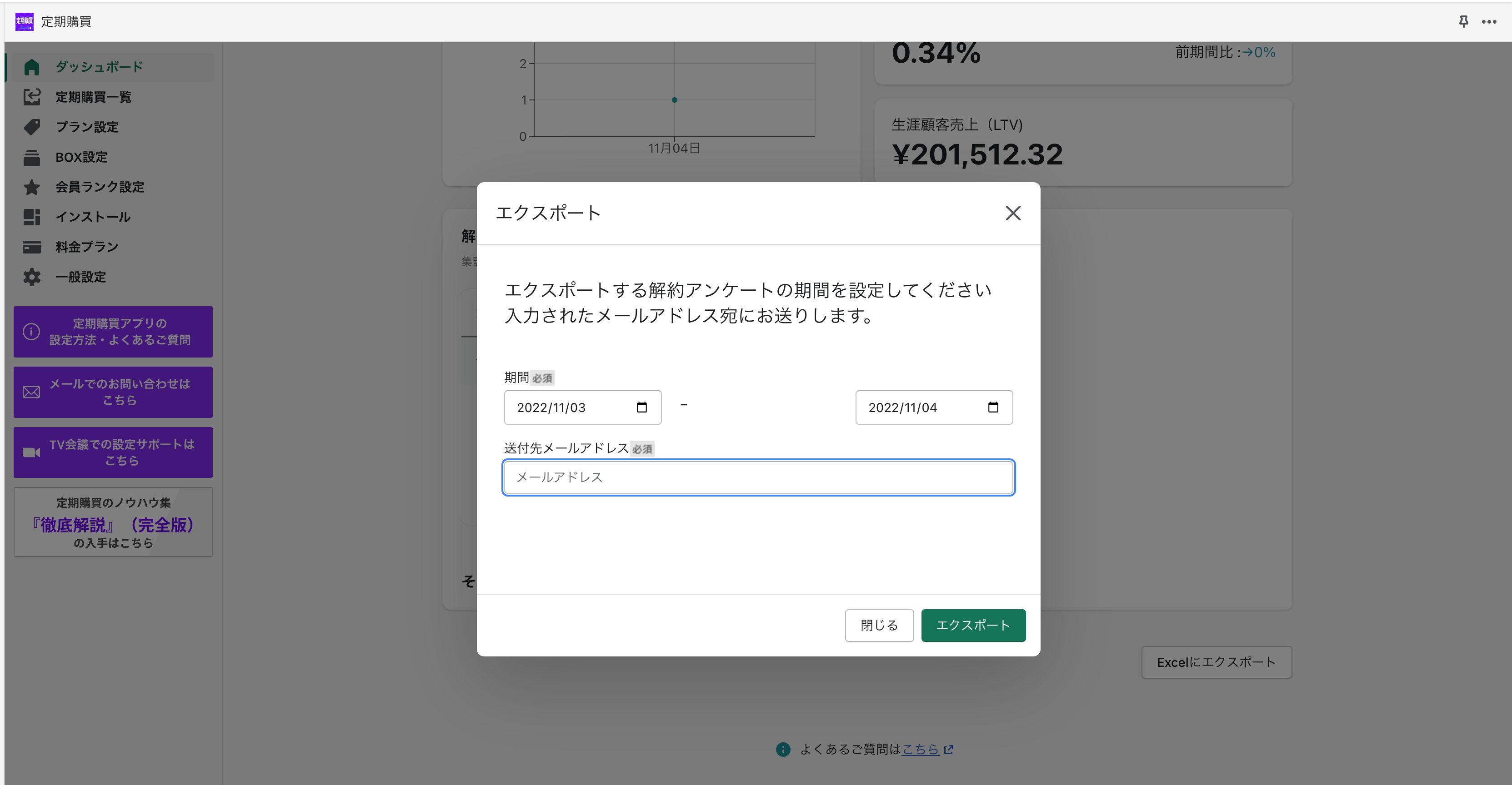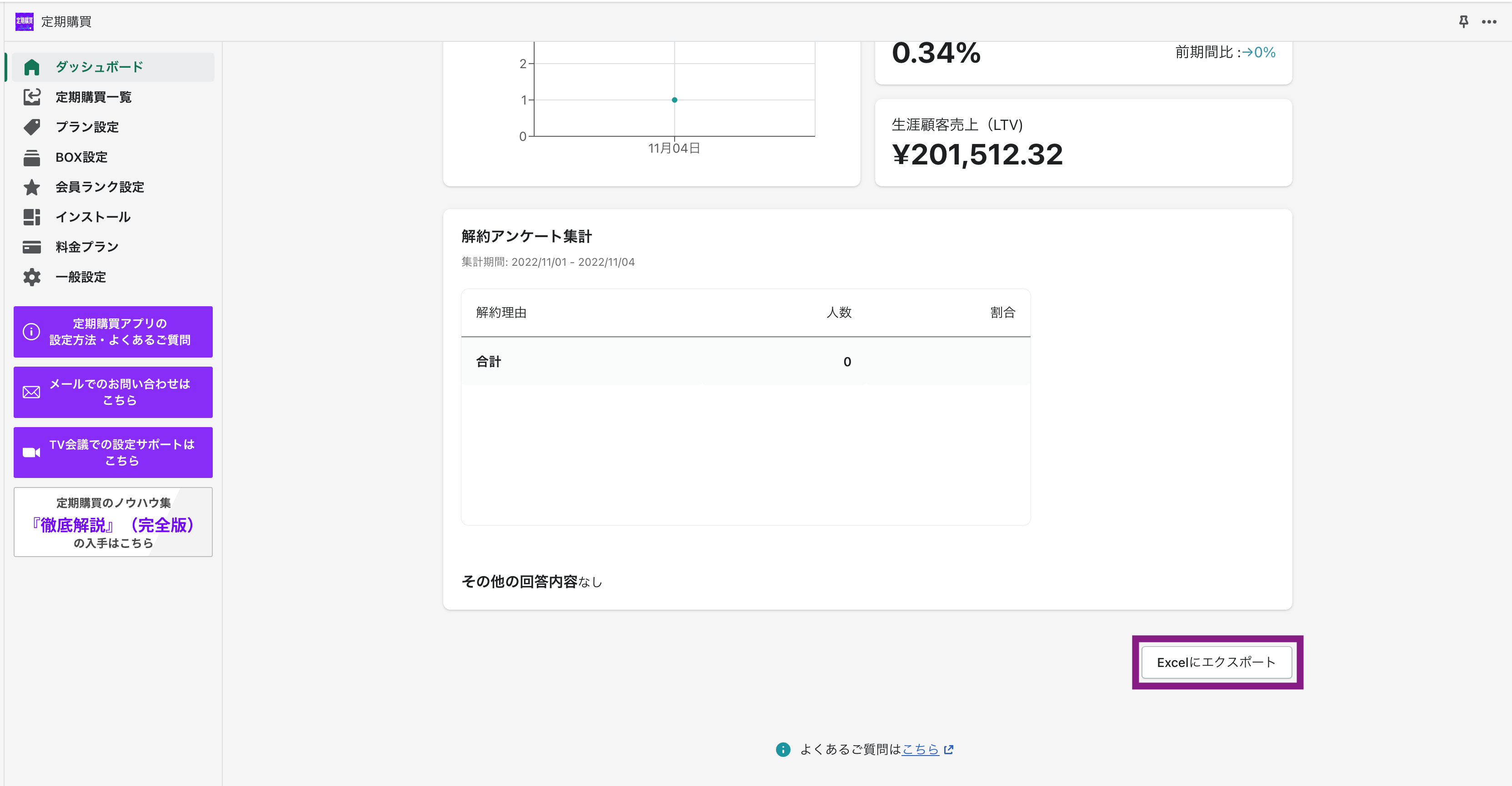ダッシュボード下部から解約アンケートの内容をCSV形式でエクスポートすることができます。