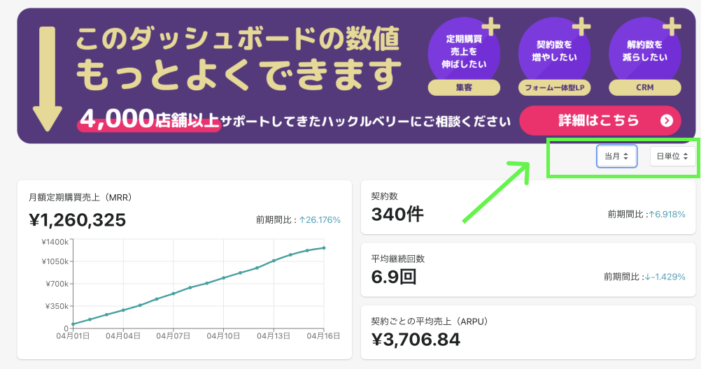 契約ごとの平均売上(ARPU) | ¥ | 指定期間における1契約あたりの平均単価 | 指定期間のMRR÷指定期間の契約数 |