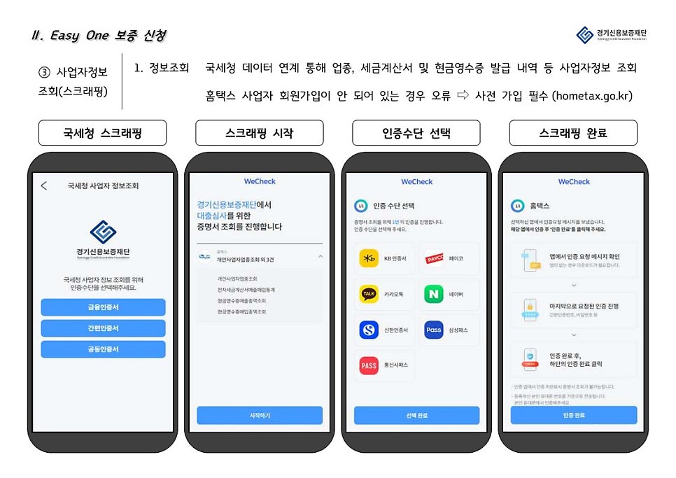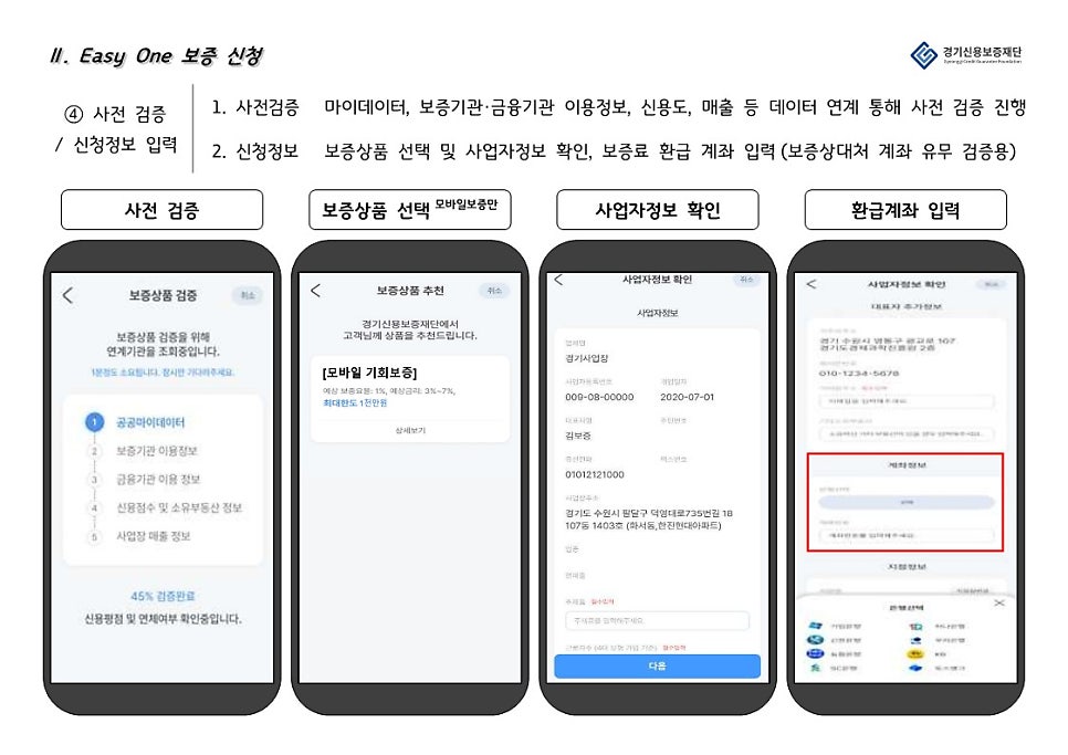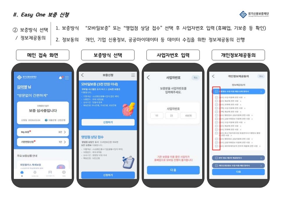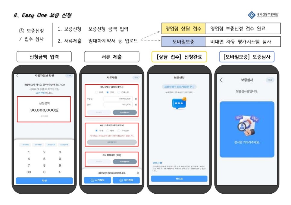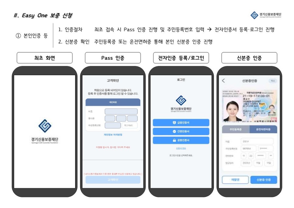 경기신용보증재단 “Easy One”은 은행 앱과 연계하여 경기도 소상공인을 대상으로 비대면으로 보증, 대출 서비스를 제공하는 앱 입니다.