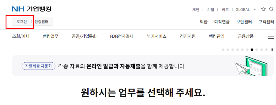 상단에 기업 또는 개인 선택 후 로그인 선택해주세요.
