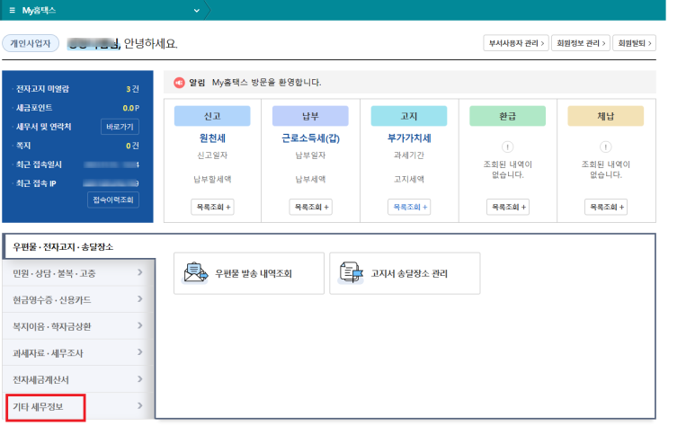My 홈택스 → 왼쪽 하단의 '기타 세무정보'를 클릭합니다.